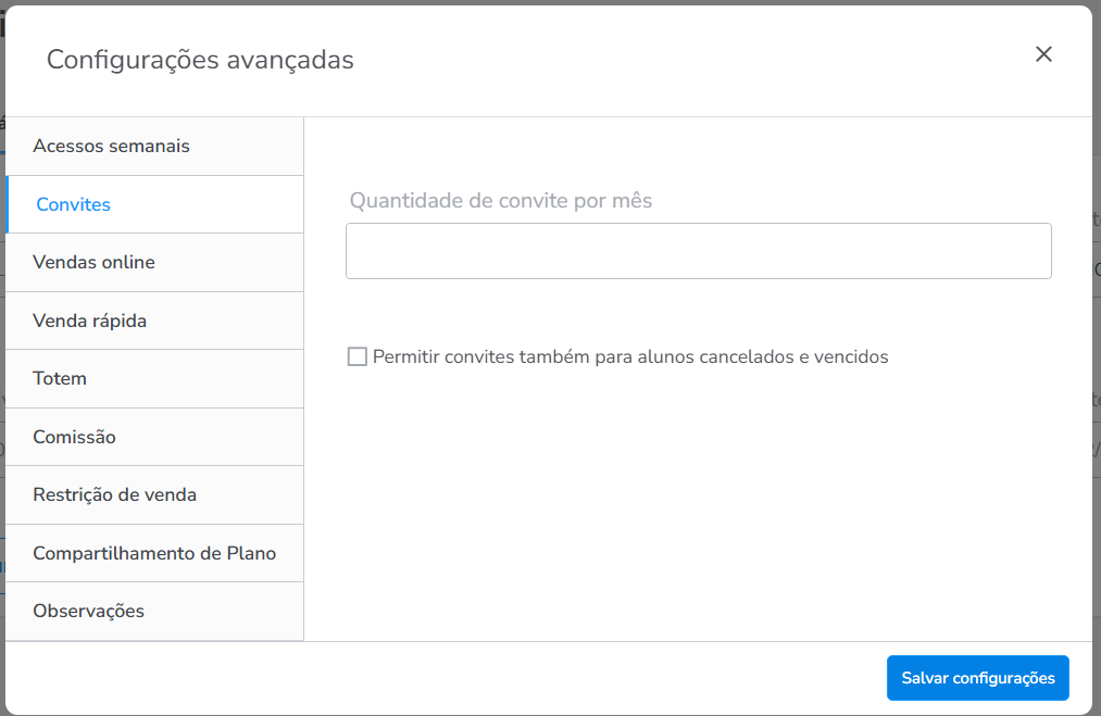 Dica: nas configurações da empresa, na aba “Restringir convidado a ter somente um convite por mês por convidante“, é possível restringir que um convidado possa vir acompanhando dois alunos diferentes no mesmo mês. Se um mesmo convidado precisar vir com outro aluno, precisa esperar o mês seguinte para conseguir ter o acesso. - Permitir convites também para alunos cancelados e vencidos: ao marca essa opção clientes que são ex-alunos com status cancelado ou vencido, também poderão utilizar o convite.