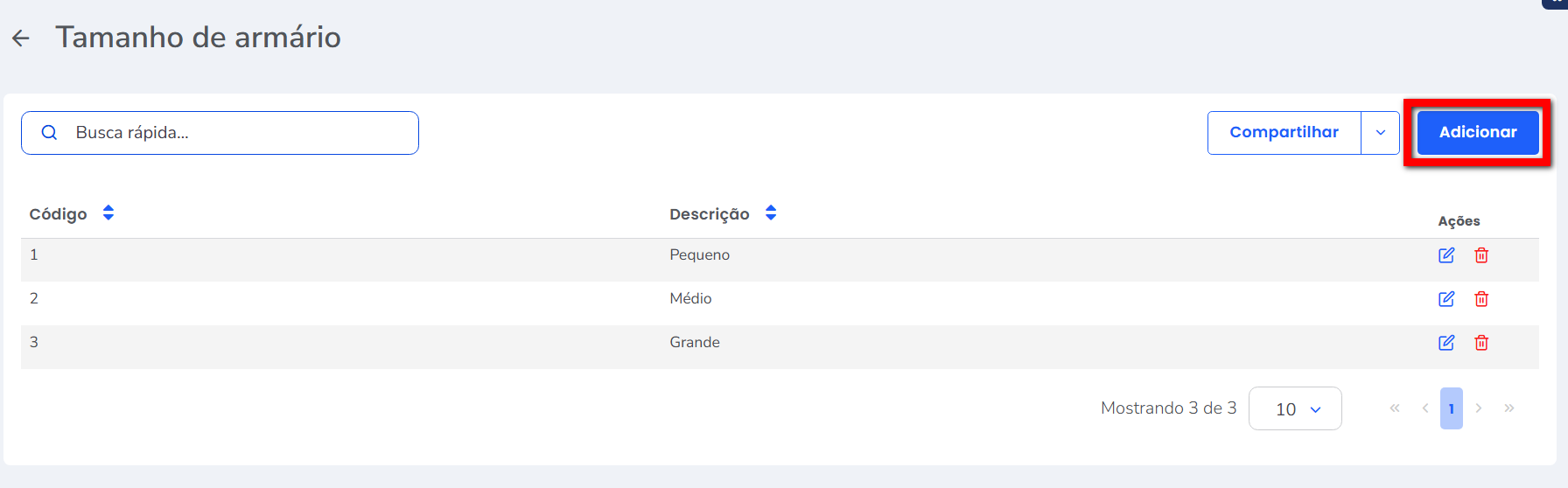 Este cadastro tem como objetivo registrar os tamanhos dos armários que serão utilizados na ferramenta “Gestão de Armários“. Ao realizar esse registro, será possível ter um controle detalhado dos diferentes tamanhos disponíveis, facilitando o processo de alocação e utilização.