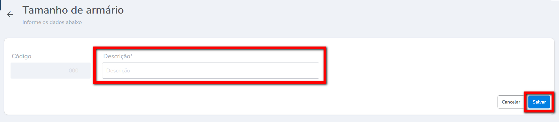 3. Na tela de cadastro, preencha o campo “Descrição” com o nome do tamanho de armário desejado, exemplo: médio, depois clique em “Salvar”.