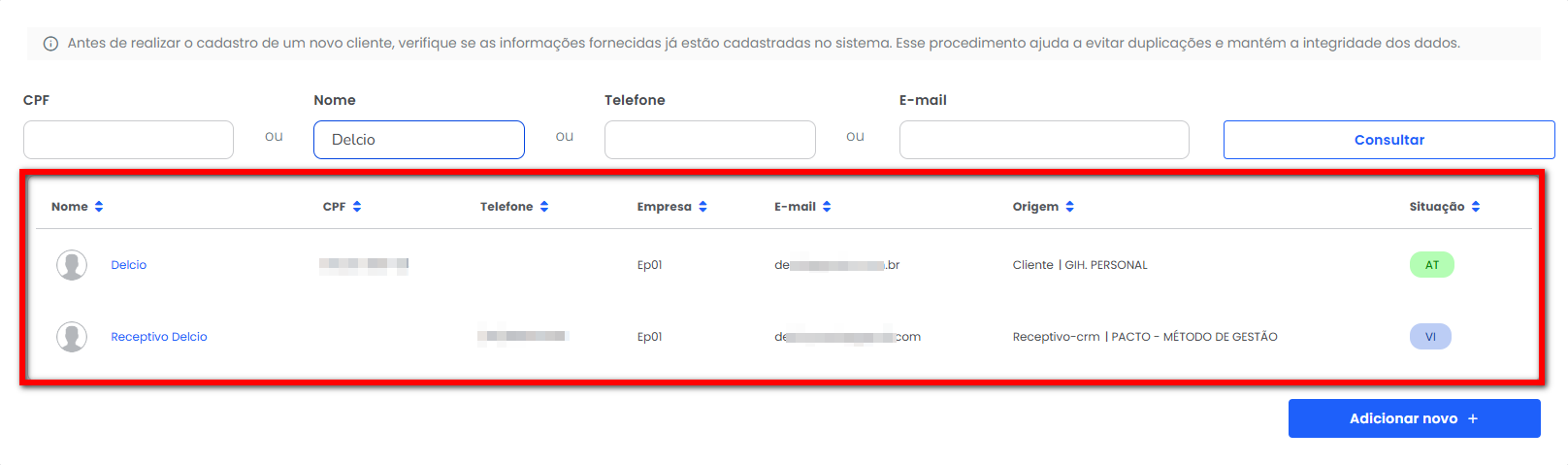 2.2. Caso não seja identificado o cadastro do cliente, clique em “Adicionar novo“.