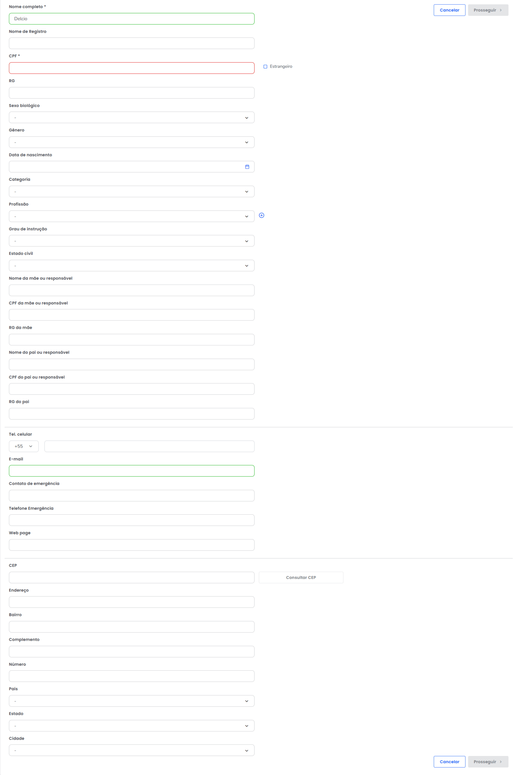 Atenção: para alunos menores de 18 anos, os dados da Mãe ou responsável são obrigatórios de preenchimento.