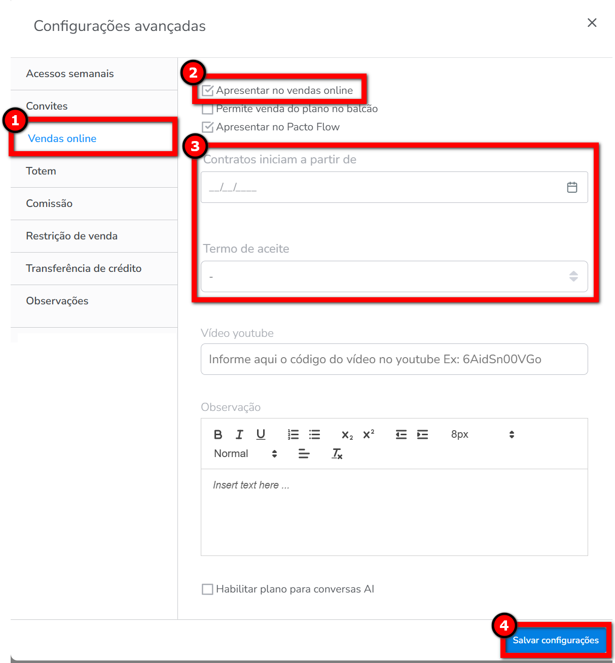 Atenção: se a modalidade estiver vinculada a uma turma, o sistema não permitirá que o plano seja salvo. Nesse caso, será exibida a seguinte mensagem: “Um plano de Site (Participa das vendas online) deve conter apenas modalidades sem turma” e não será possível concluir o cadastro do plano.