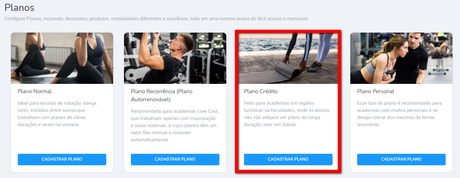 3. Identifique a opção “Plano Crédito“, e clique em “Cadastrar Plano“;