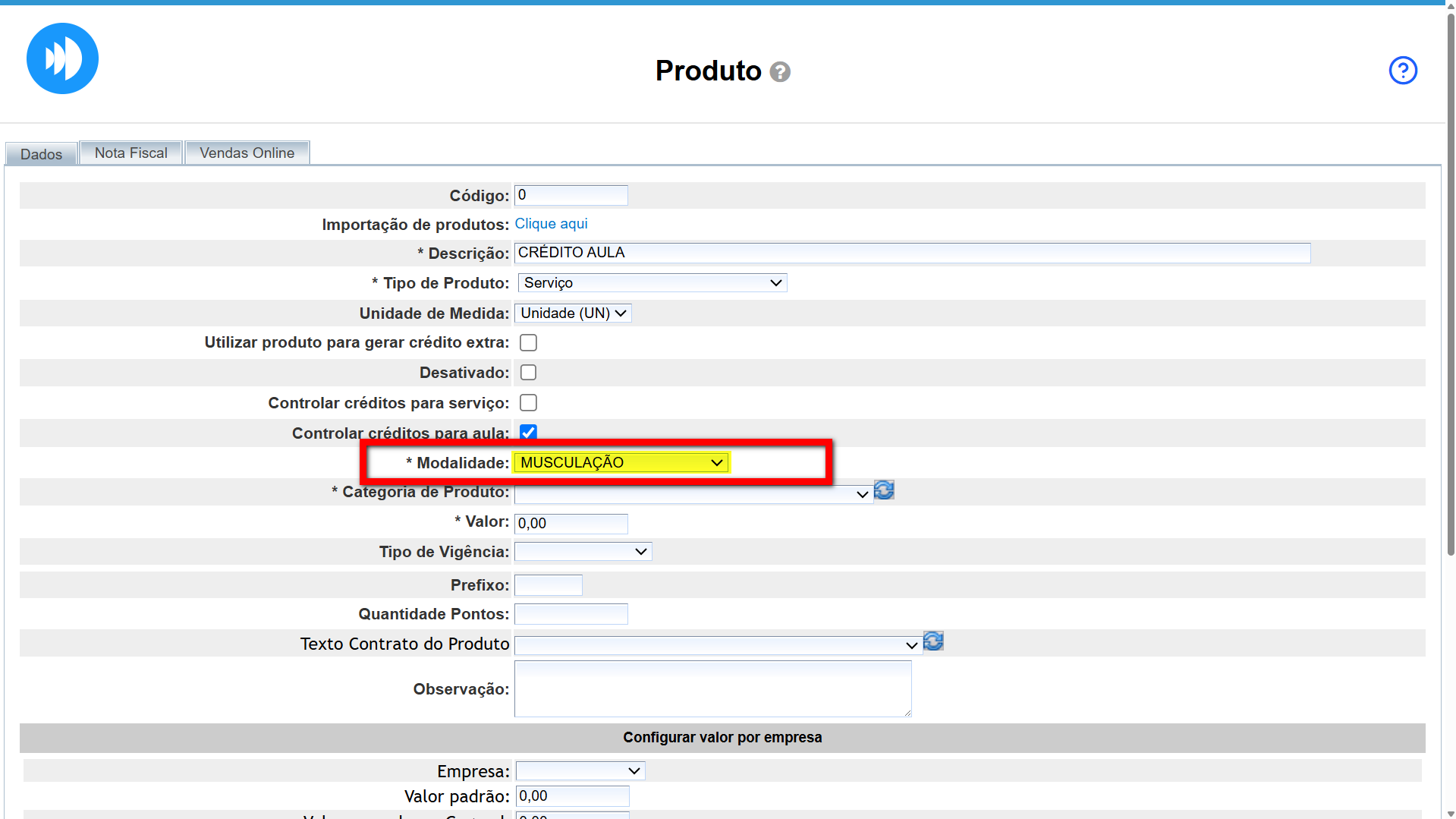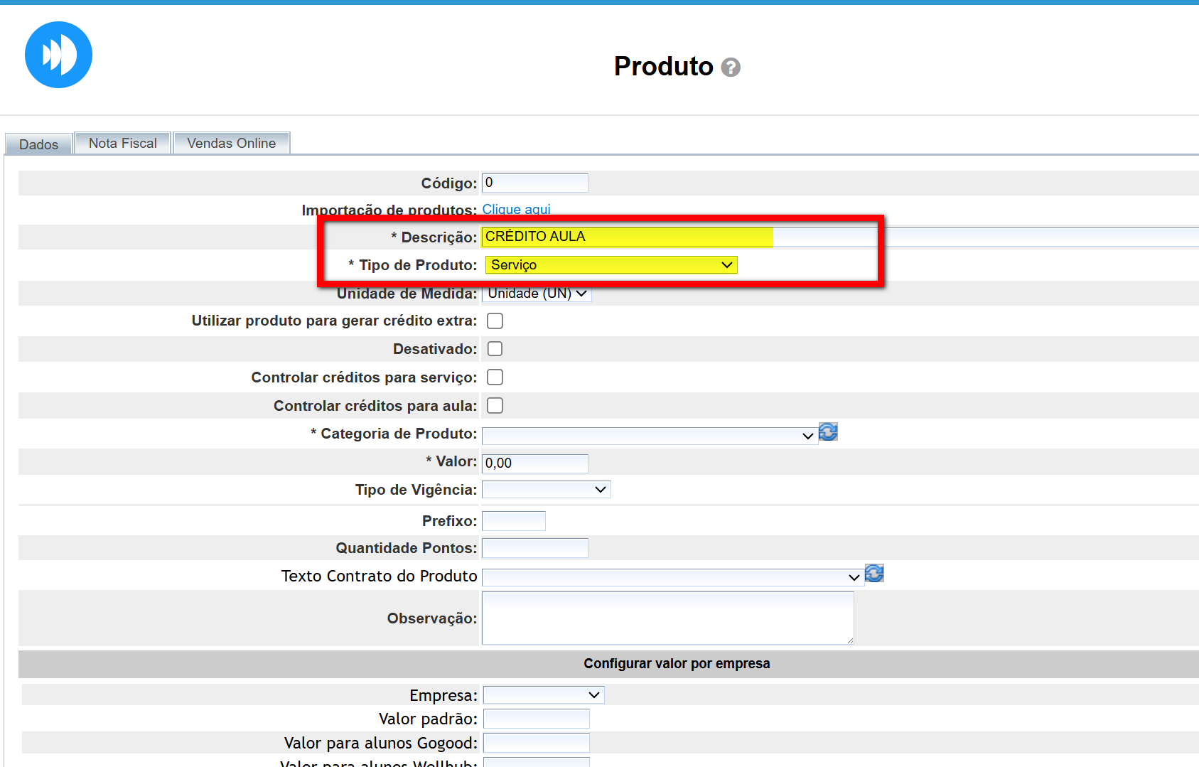 3. Preencha o campo Descrição com o nome do produto, por exemplo “CRÉDITO AULA”, e selecione o tipo de produto “Serviço”;