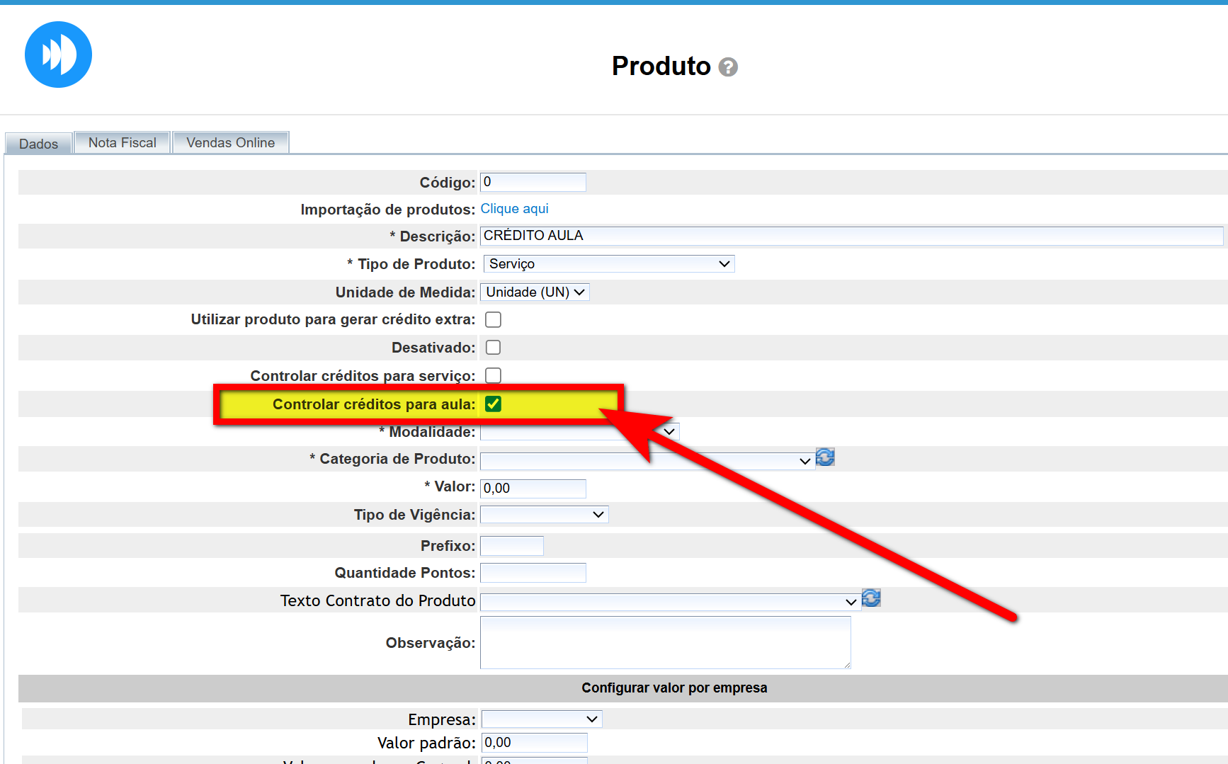 A opção Controlar créditos para aula permite que a academia venda e gerencie créditos específicos para aulas coletivas.