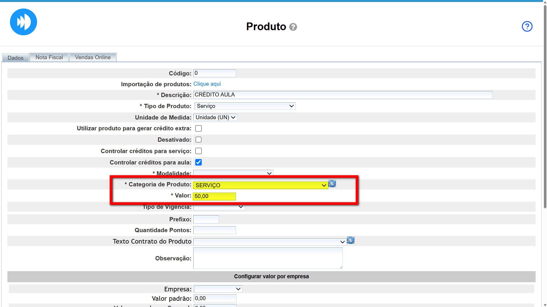 Para saber como cadastrar um produto para controle de créditos de serviço, clique aqui.