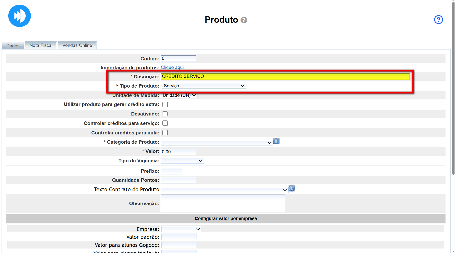 3. Preencha o campo Descrição com o nome do produto, por exemplo “CRÉDITO SERVIÇO”, e selecione o tipo de produto “Serviço”;