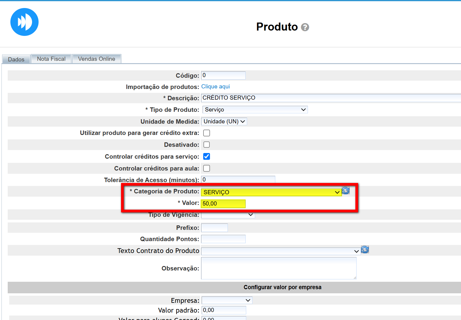 Para saber como cadastrar um produto para controle de créditos de aula, clique aqui.