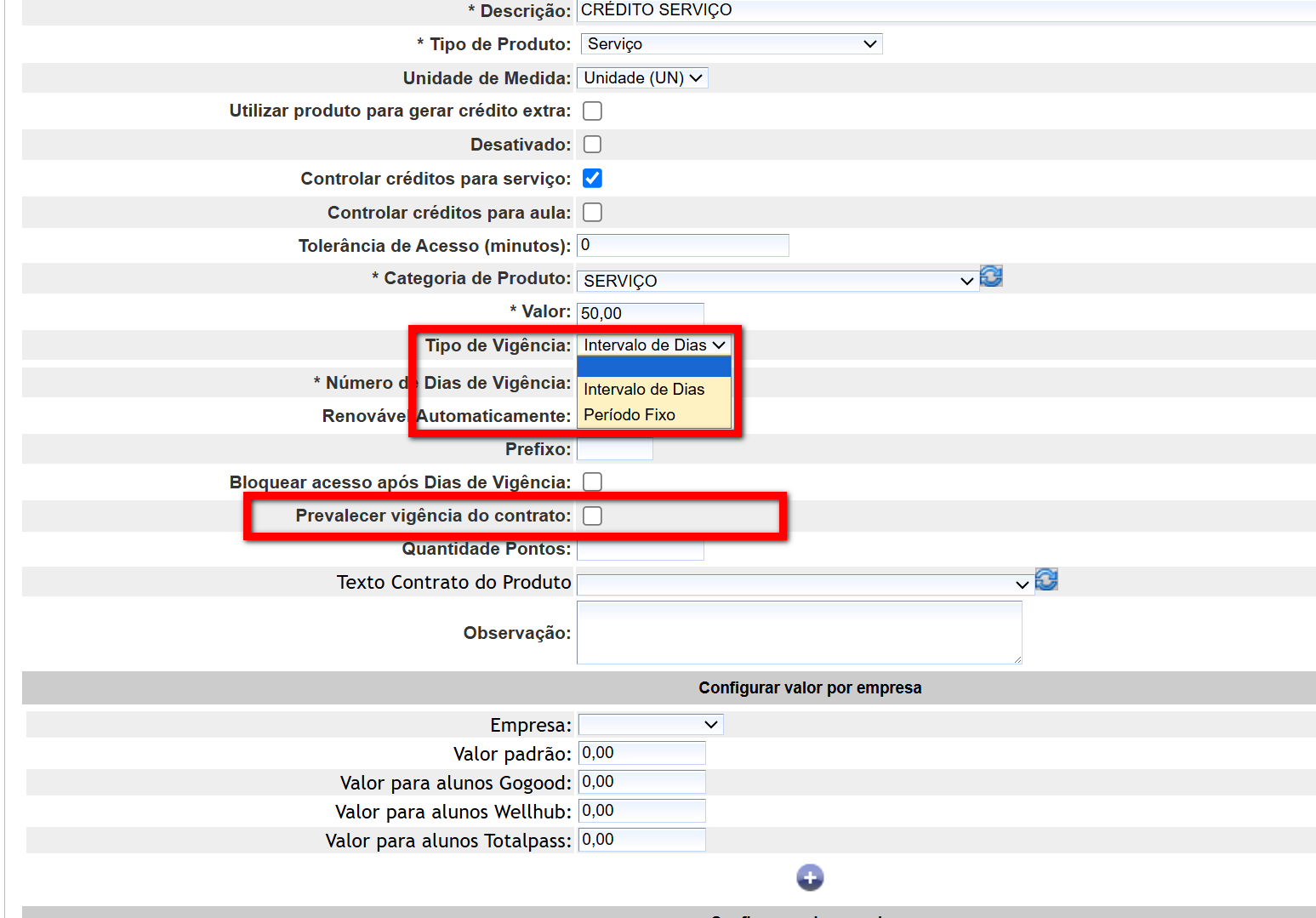 - Configurar valor por plano: esse recurso é específico para academias que utilizam banco multiempresa, permitindo definir valores diferentes para um mesmo plano em cada unidade do grupo.