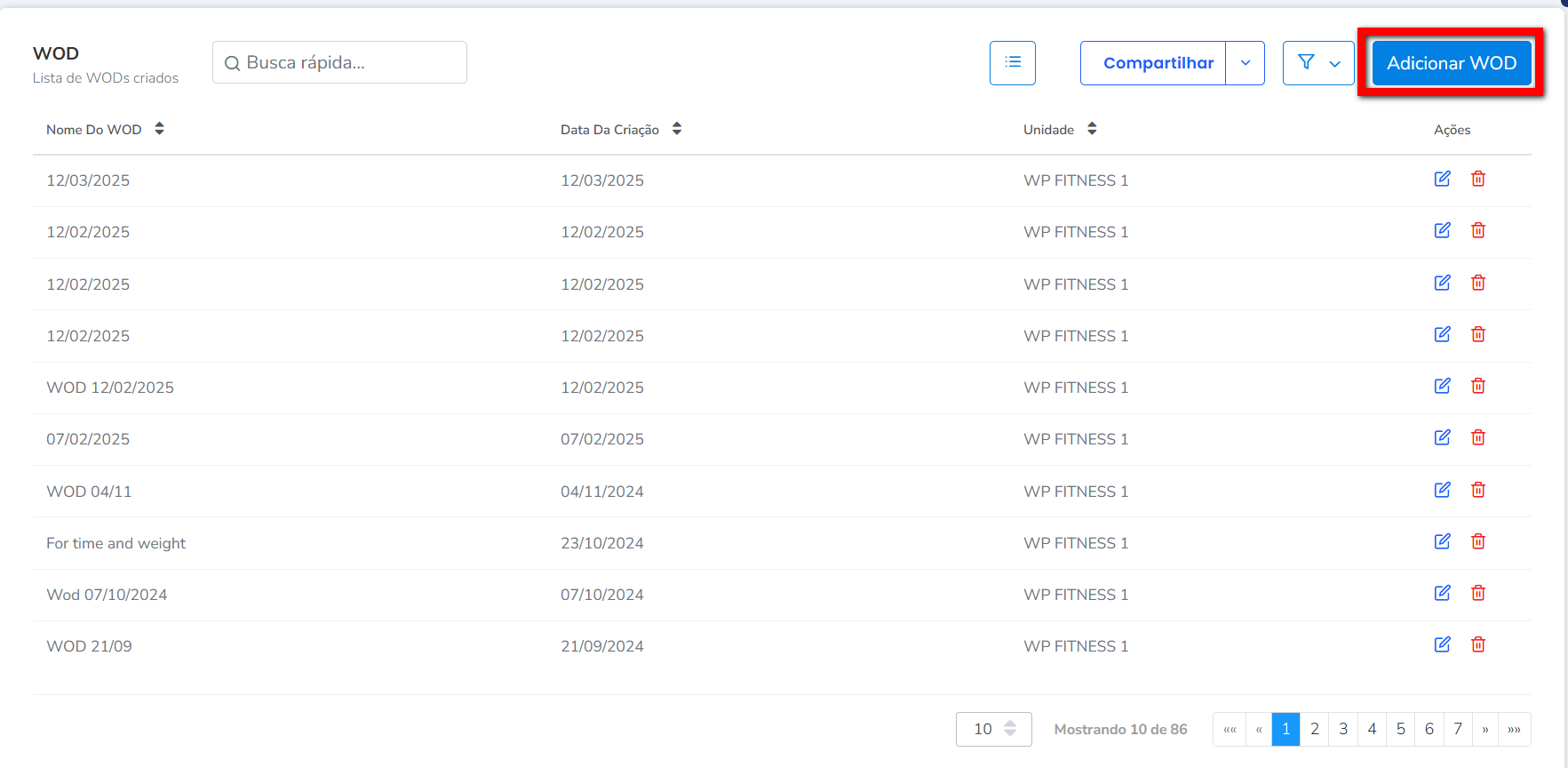 2. Será exibida a tela com o cadastro de todos os WOD já lançados no sistema. Para incluir um novo, basta clicar no botão “Adicionar WOD“;