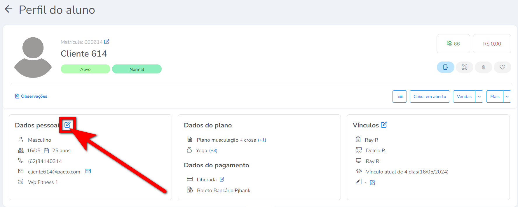 1. Ao acessar o perfil do aluno em “Dados Pessoais“ clique no ícone