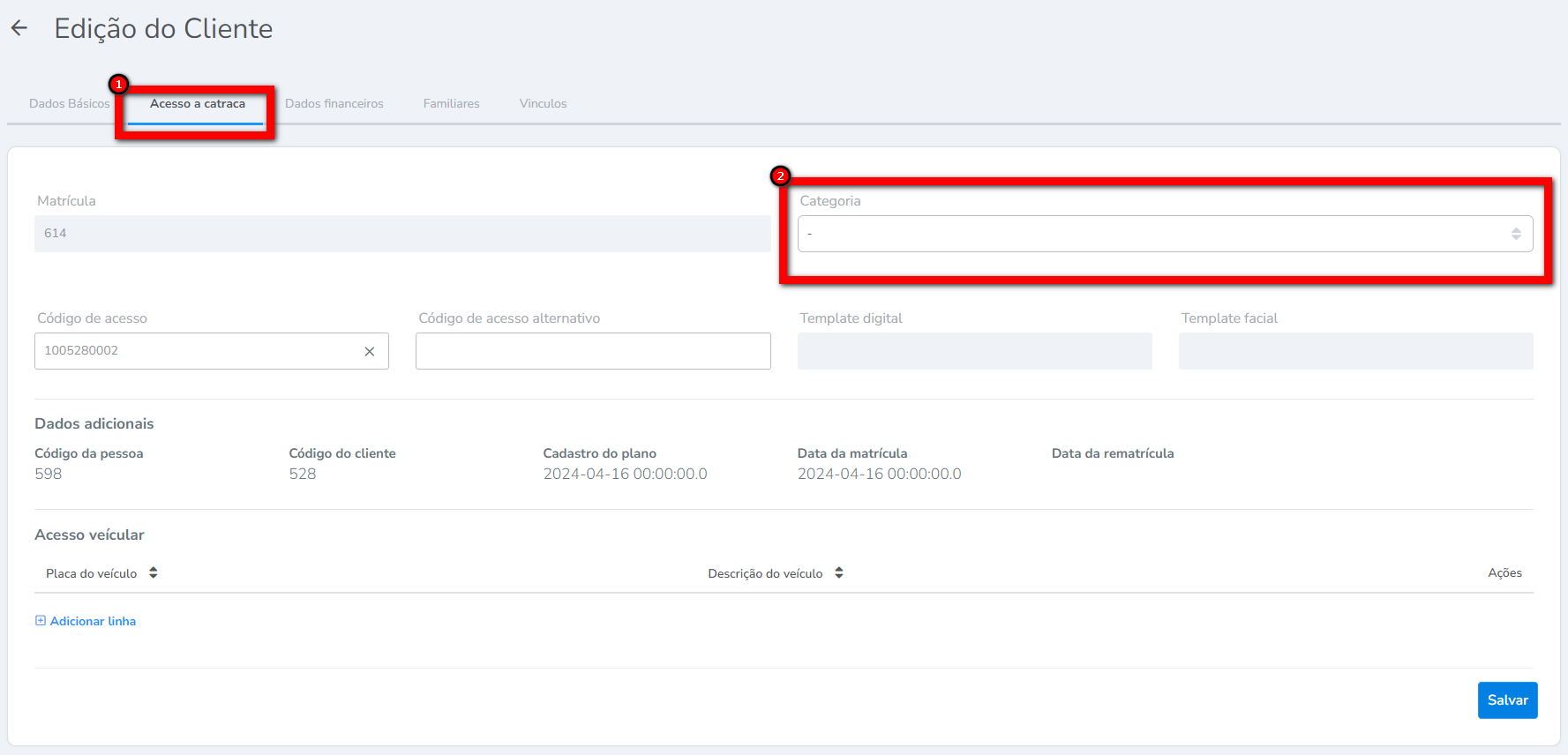 2. Será apresentada uma nova tela, clique na guia “Acesso a catraca“, e localize o campo “Categoria“;