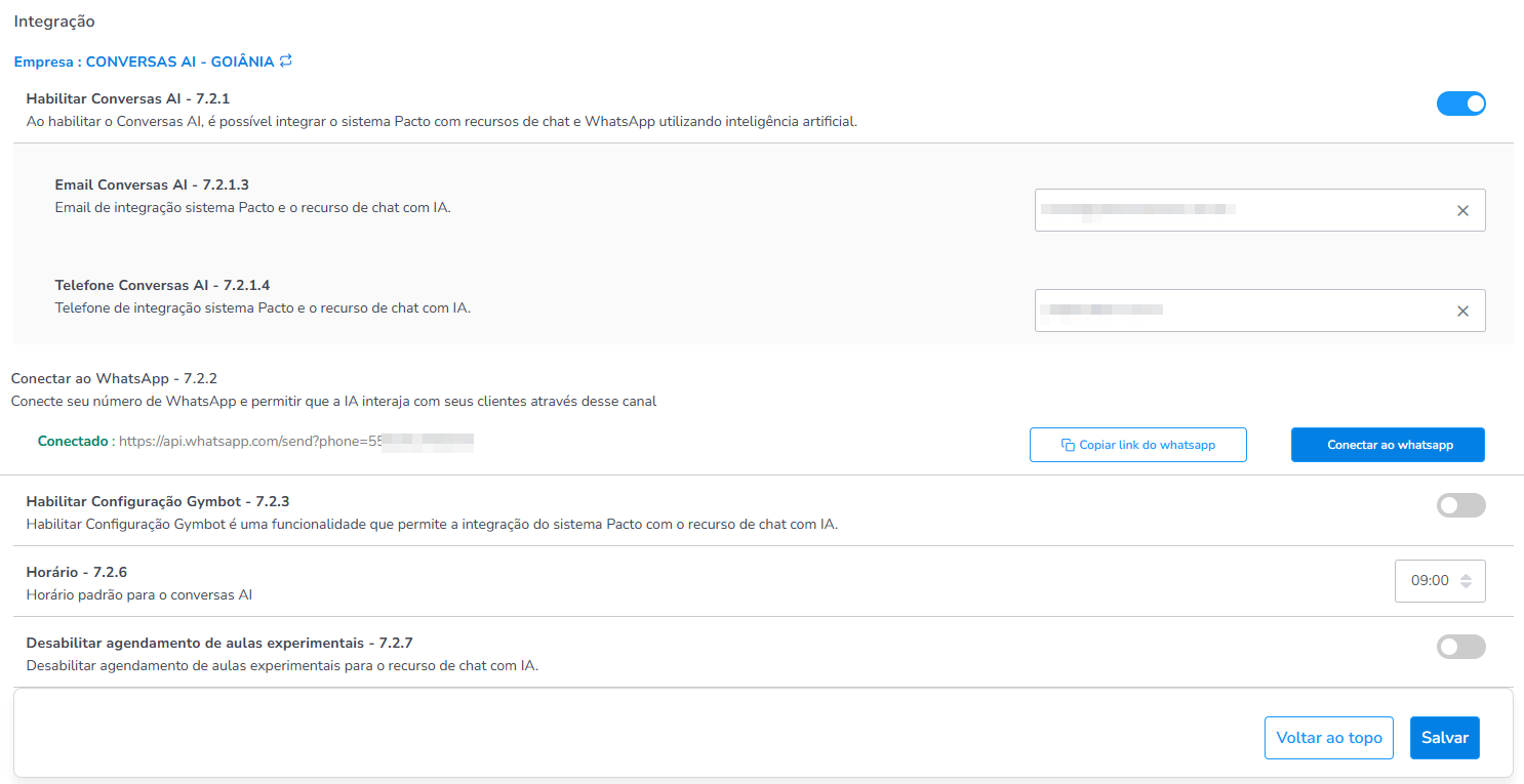 - Telefone Conversas AI – 7.2.1.4: Informe o número de telefone do proprietário ou gestor da academia. Esse telefone será usado para receber notificação caso o Conversas.AI tenha problemas ou pare de funcionar.