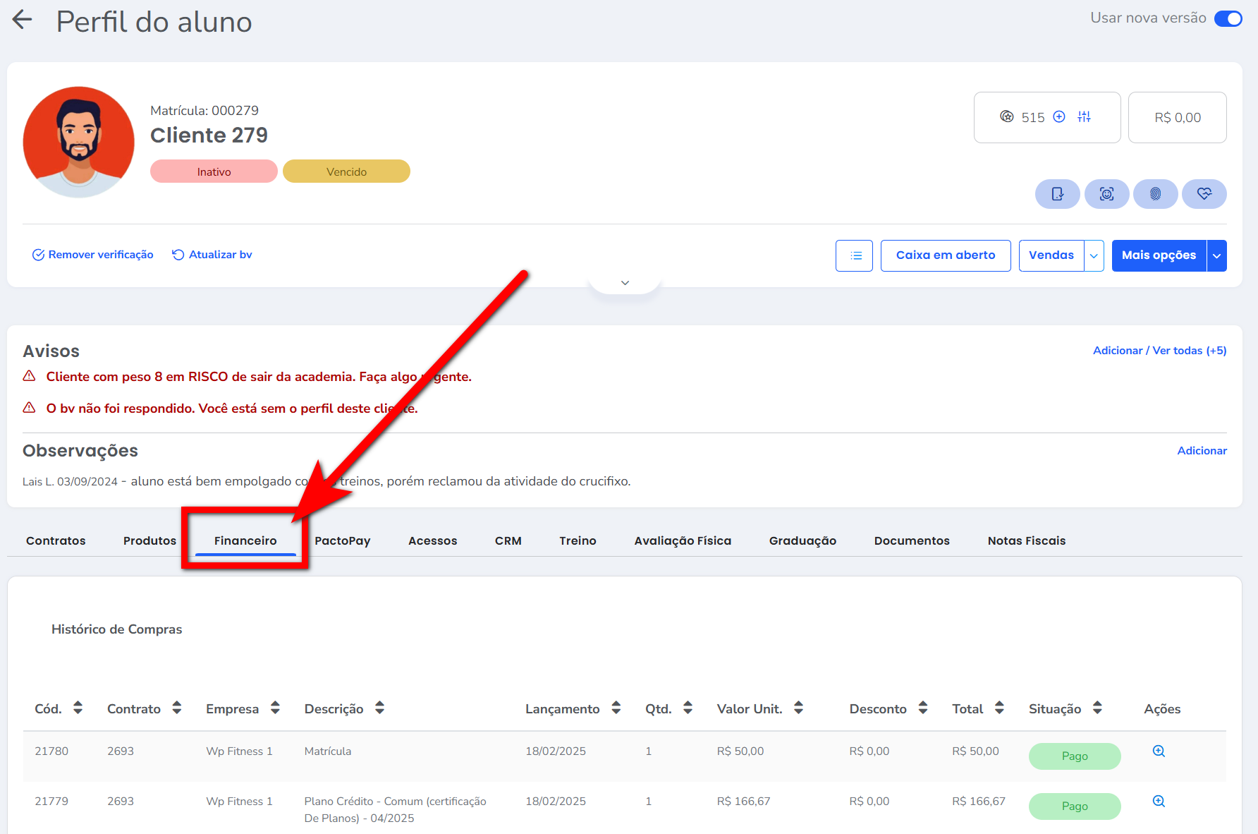 1. Acesse o perfil do aluno que deseja estornar o recibo e clique sobre a guia “Financeiro“;