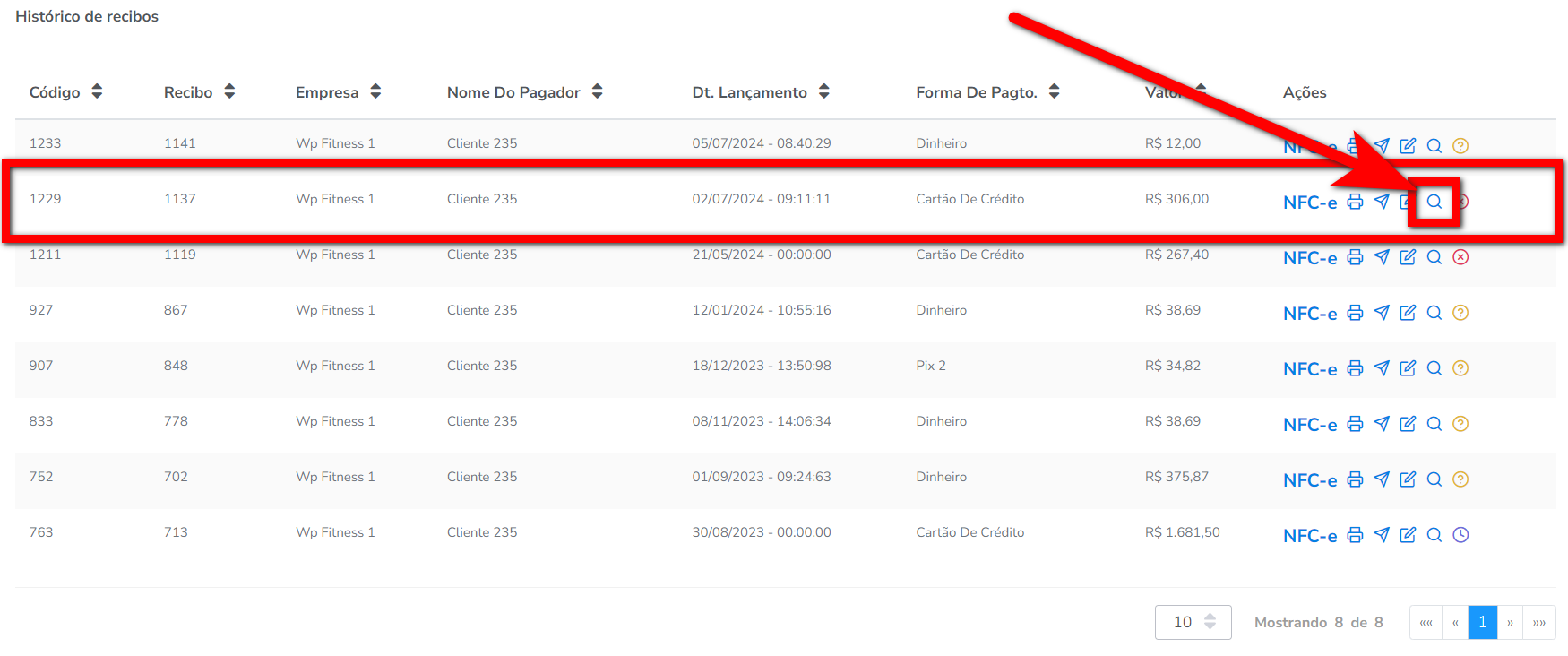 2. No campo “Histórico de recibos“, você encontrará uma lista de todos os recibos associados a esse aluno. Identifique o recibo que deseja estornar e clique no ícone