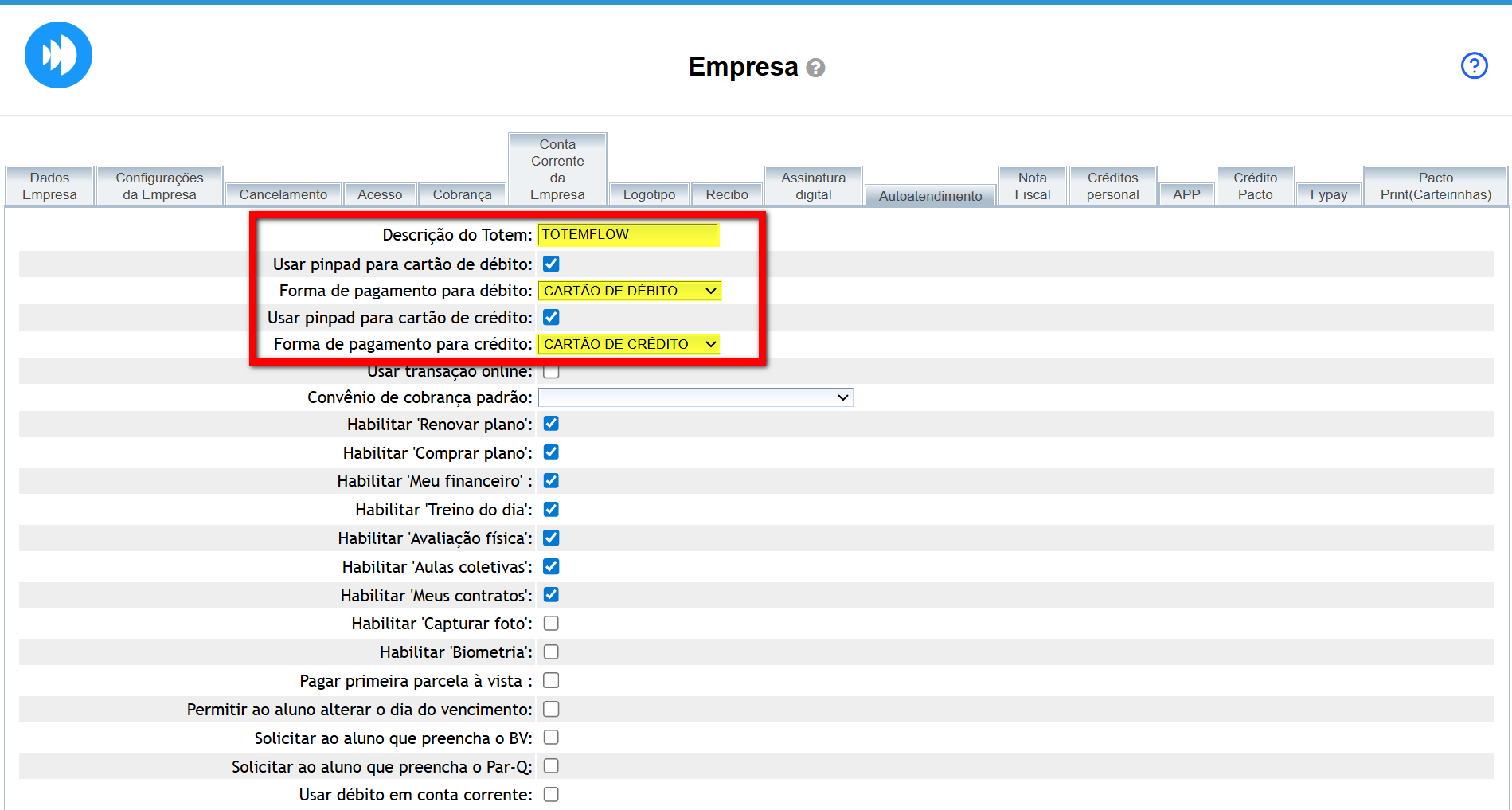 Lembrando que as configurações de PINPAD e CONVÊNIO DE COBRANÇA já devem estar configuradas no sistema, antes de configurar o Autoatendimento.