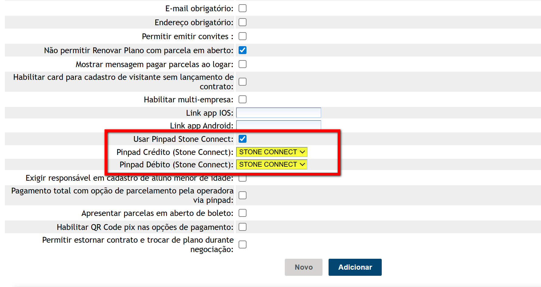 4. No bloco “Configurações de pinpad” no campo “Pinpad“, selecione a opção “Stone Connect”