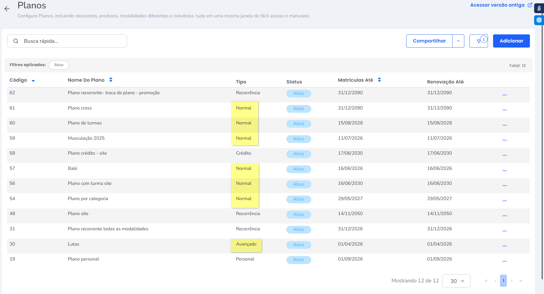 2. Na listagem localize o plano do tipo Normal ou Avançado e clique sobre ele;