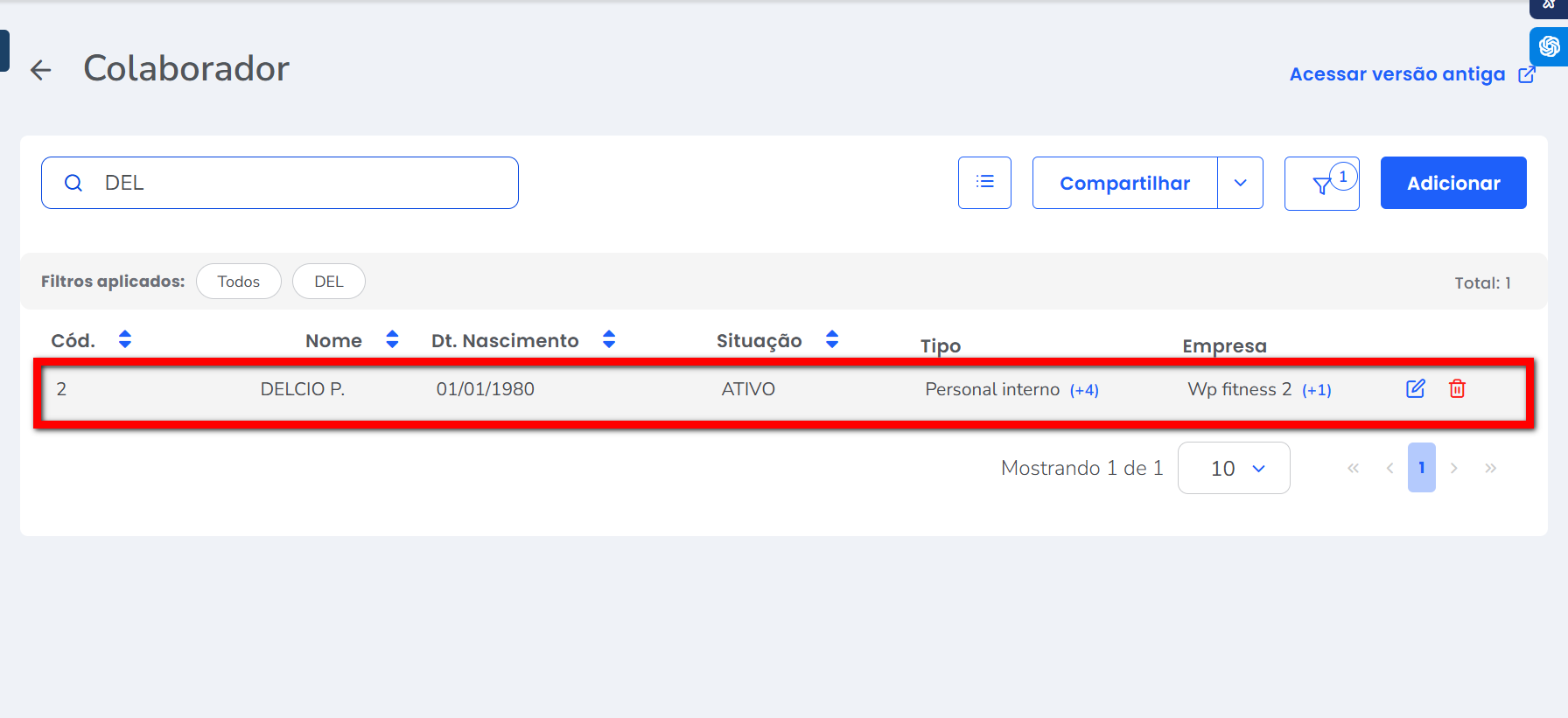 2. O sistema abrirá uma nova tela. Pesquise pelo nome do colaborador e clique sobre ele;