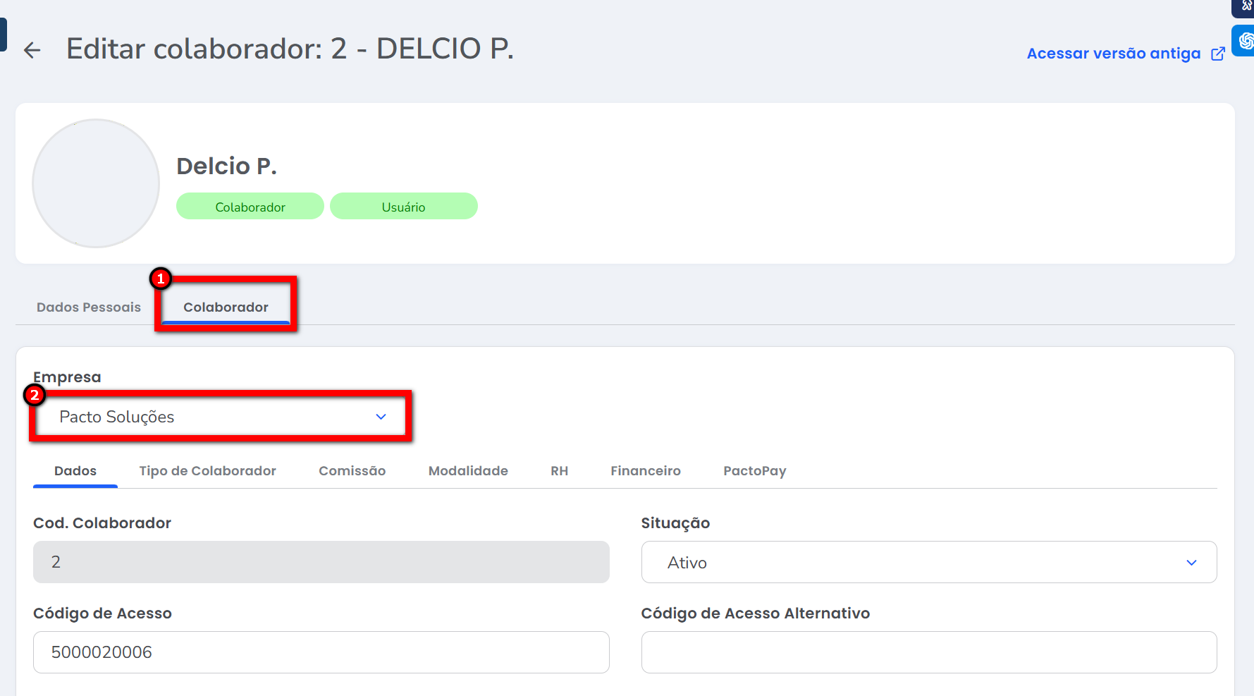 3. Na guia “Colaborador”, caso a empresa possua mais de uma unidade (banco multiempresa), selecione a unidade para a qual deseja configurar a comissão;