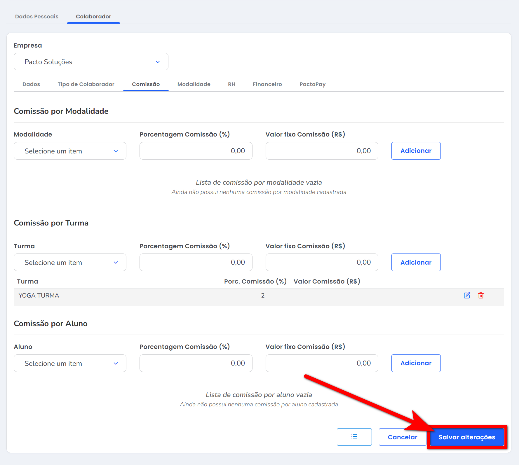 Atenção: não é possível configurar um valor fixo e uma porcentagem de comissão ao mesmo tempo, para uma mesma modalidade, turma ou aluno.