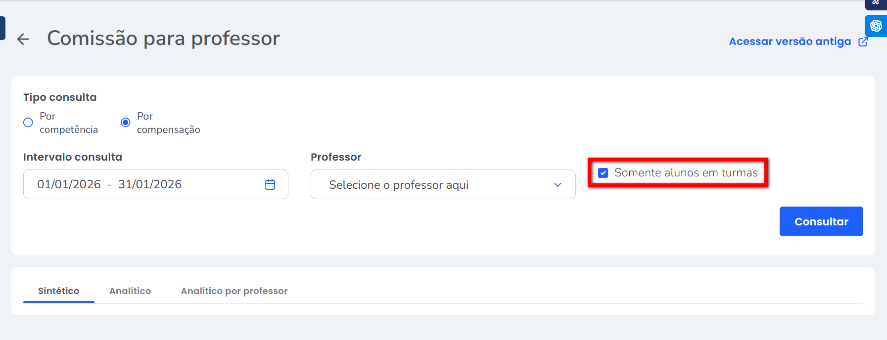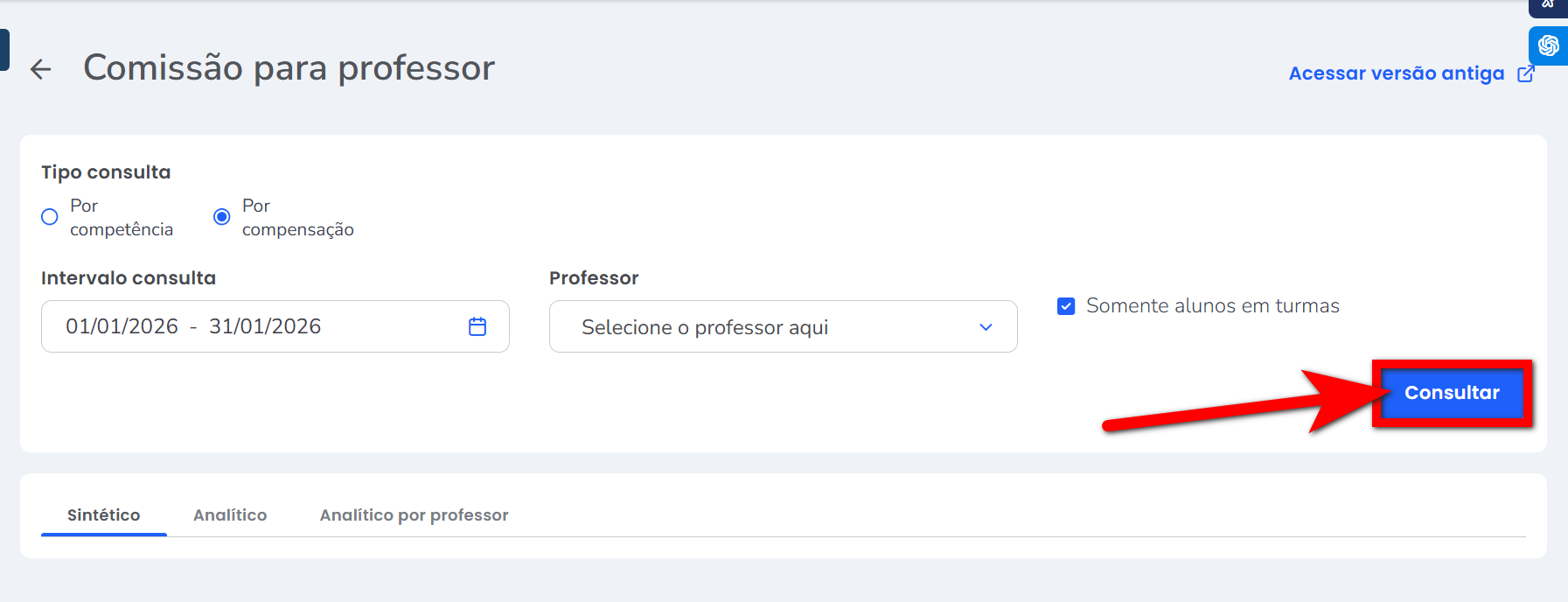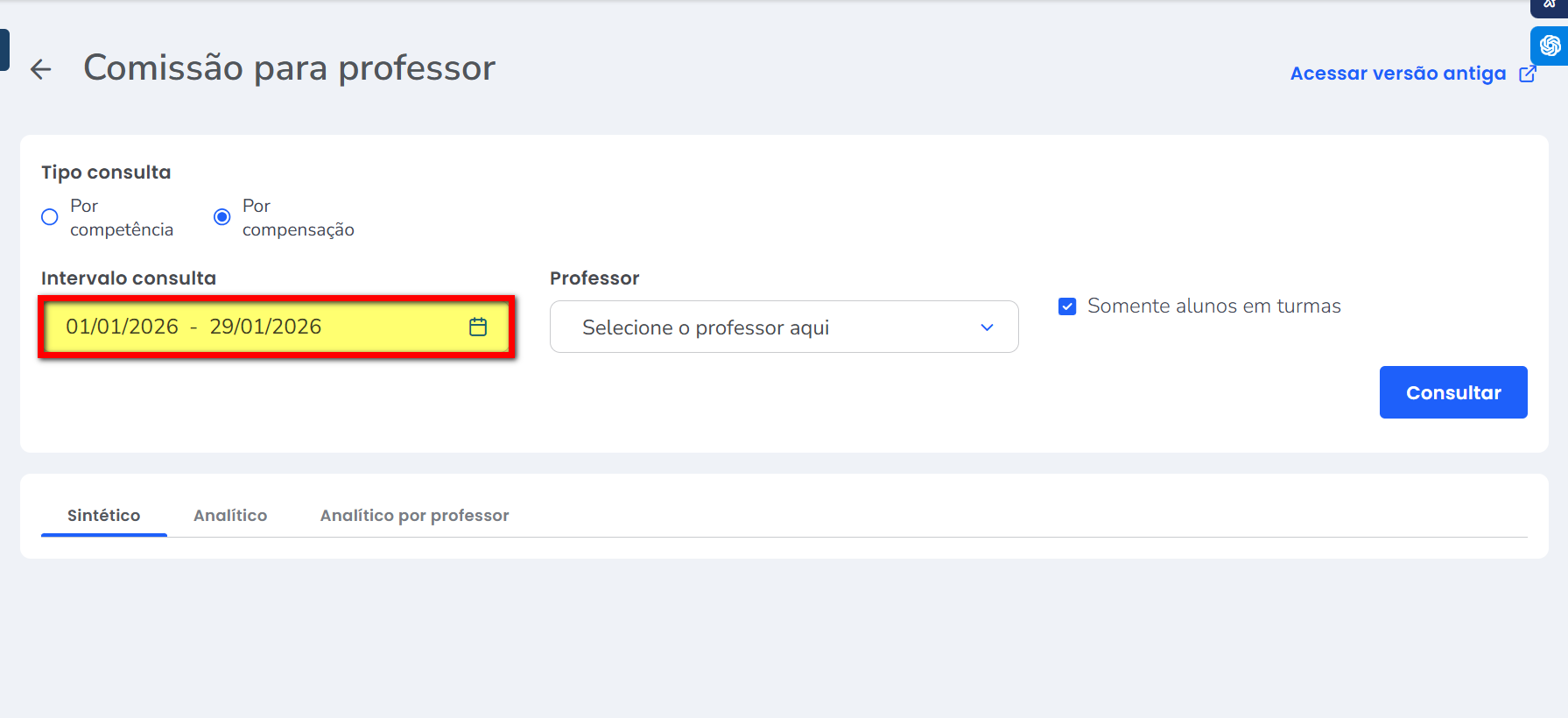 2. Em “Tipo de consulta“, defina se a consulta dessa comissão será por competência ou por compensação;