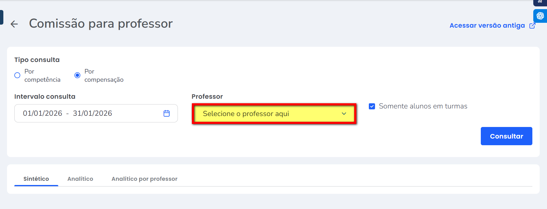 • Turma: selecione a turma vinculada ao professor que deseja realizar o pagamento da comissão;