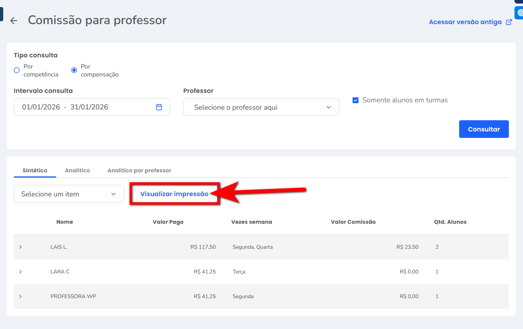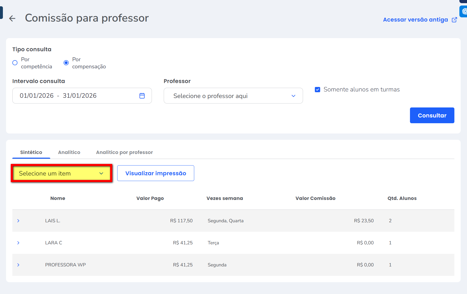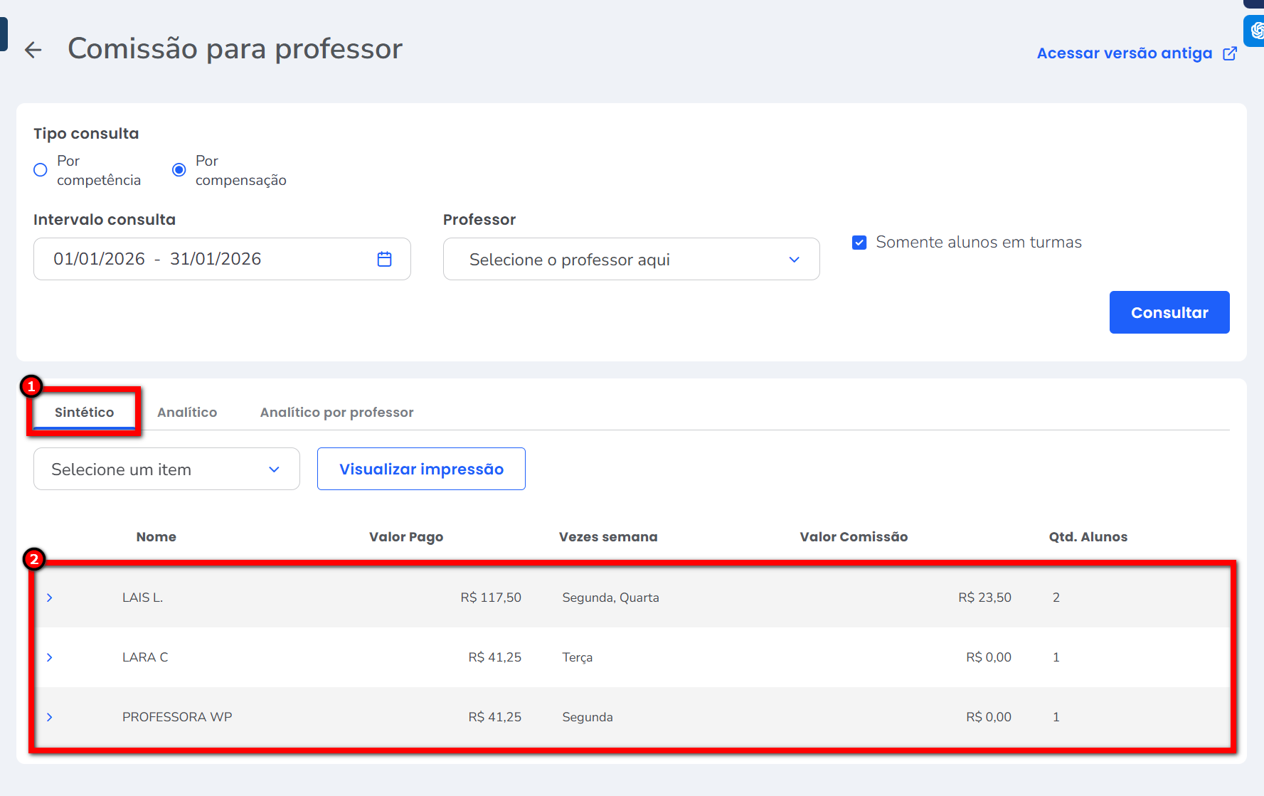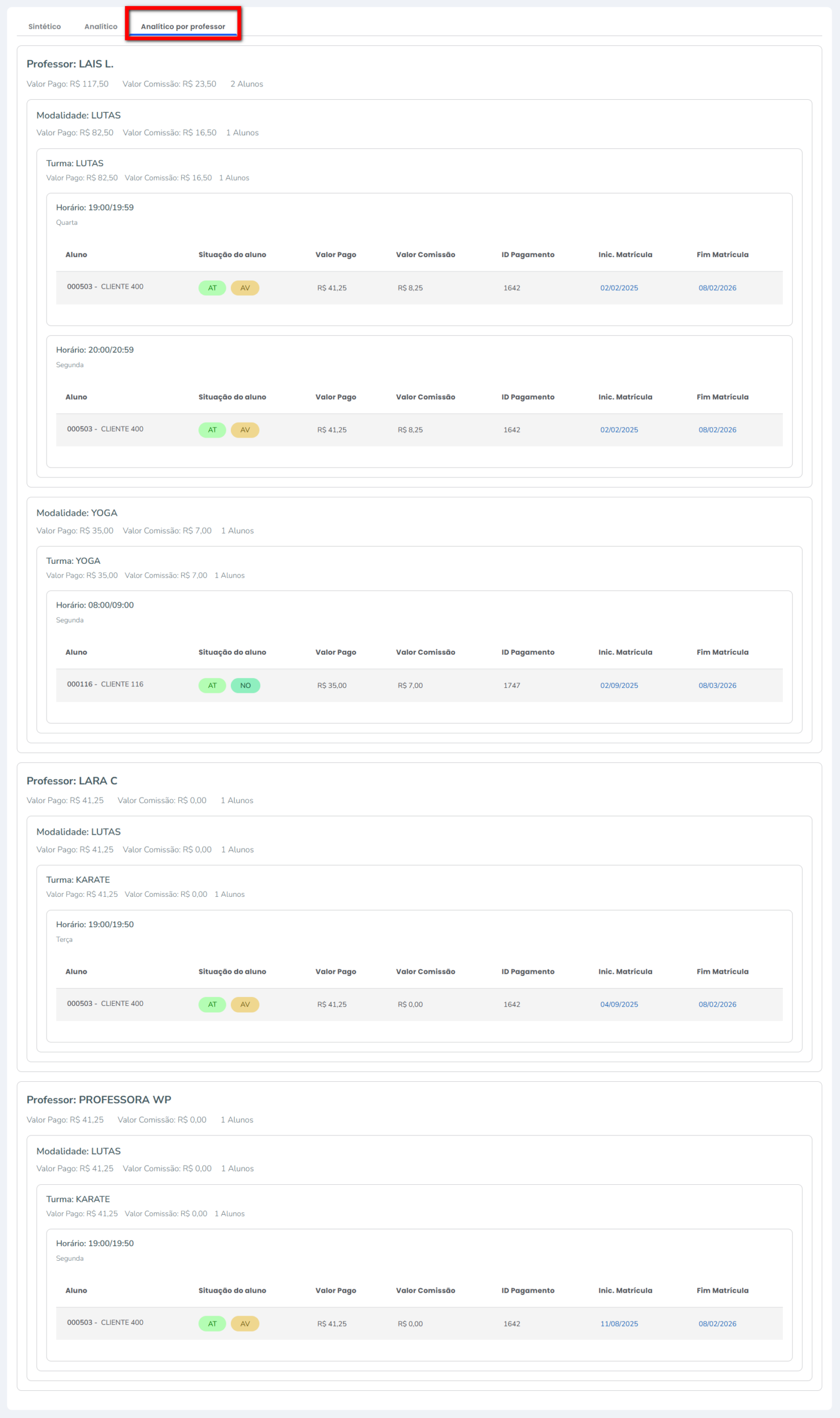 6.3. No resultado “Analítico por Professor”, é possível visualizar o detalhamento das comissões separadas por professor.