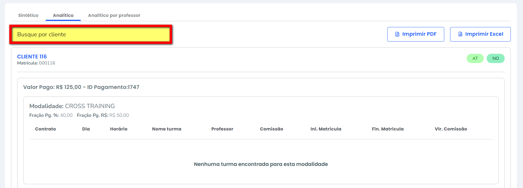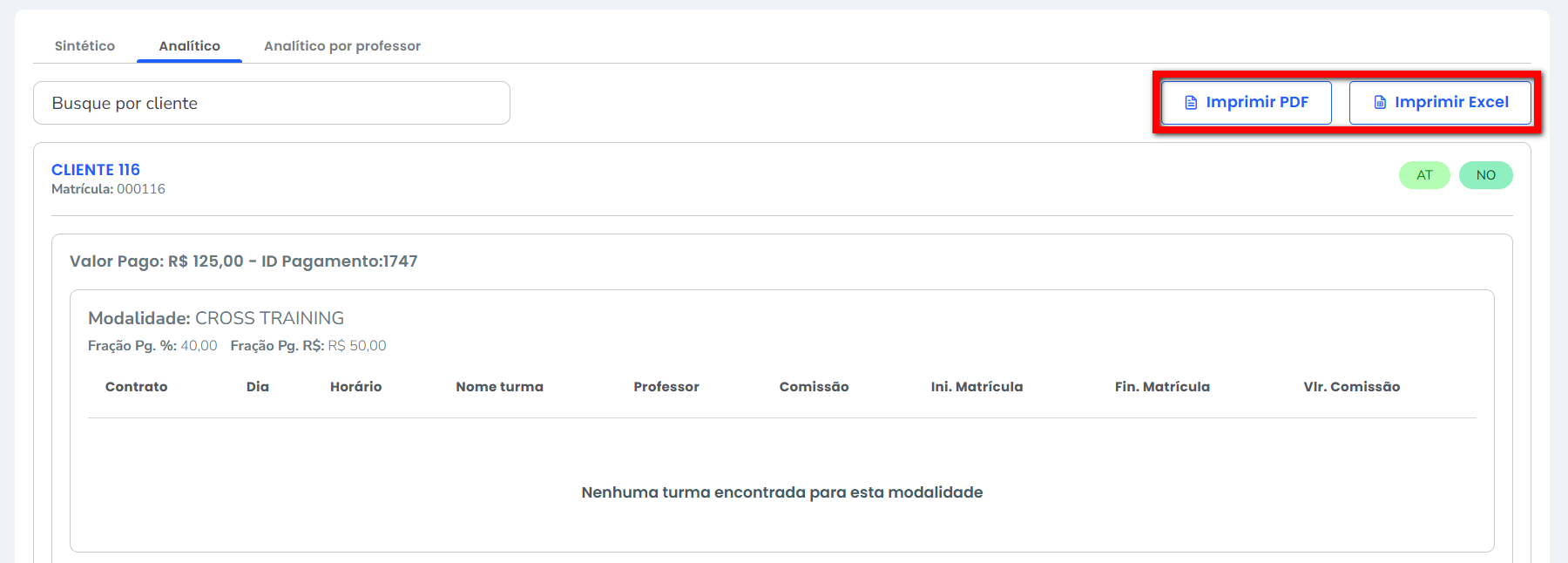 6.2. No resultado “Analítico”, é possível visualizar o detalhamento das comissões separadas por aluno;