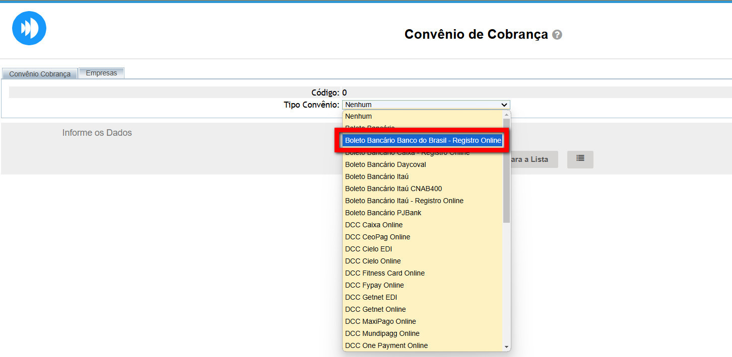 3. Na tela de cadastro, identifique o campo “Tipo de Convênio”, selecione a opção “Boleto Bancário Banco do Brasil – Registro Online”;