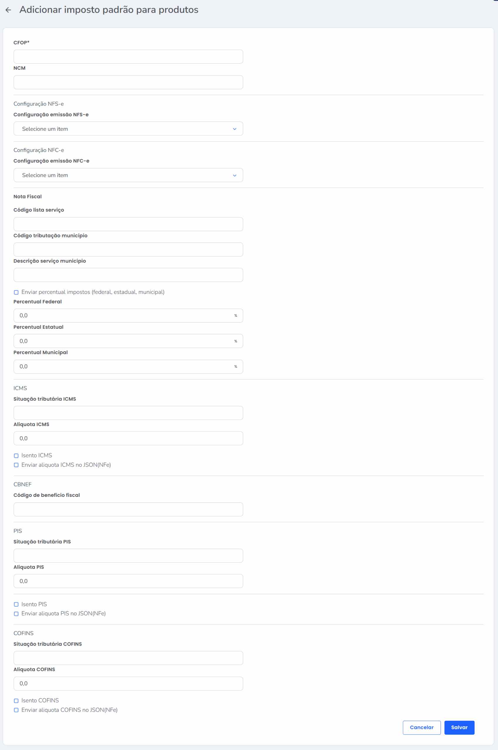 - Como funciona: ao cadastrar ou importar um produto, o sistema consulta a configuração fiscal da unidade e preenche os impostos automaticamente. A configuração de um CFOP específico aplica os impostos a todos os produtos que o utilizam. Se CFOP + NCM estiverem configurados, o imposto será aplicado se ambas as condições forem verdadeiras e os dados preenchidos corretamente.