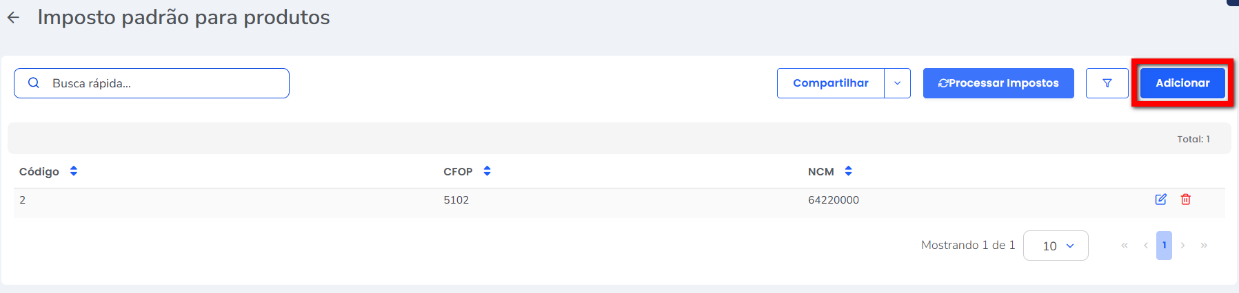 2. Em seguida será aberta a tela com os impostos já cadastrados. Para cadastrar um novo, clique em “Adicionar“;