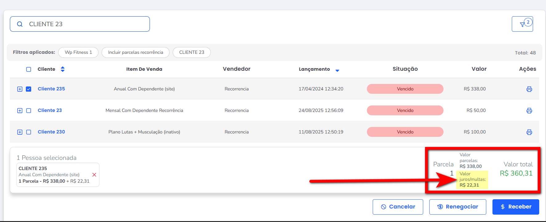 5. No caixa em aberto, o sistema já irá apresentar o valor da multa/juros para prosseguir com o pagamento da parcela em atraso.