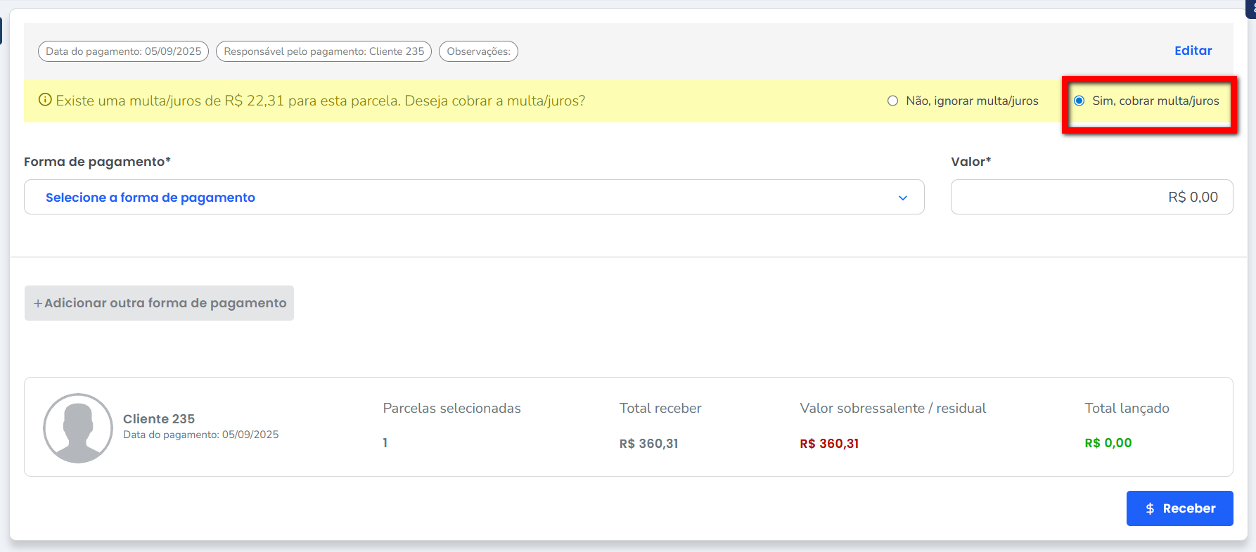 5.1. Selecione a forma de pagamento e marque se deseja “Não, ignorar Multa/juros” ou”Sim, cobrar Multa/juros“;