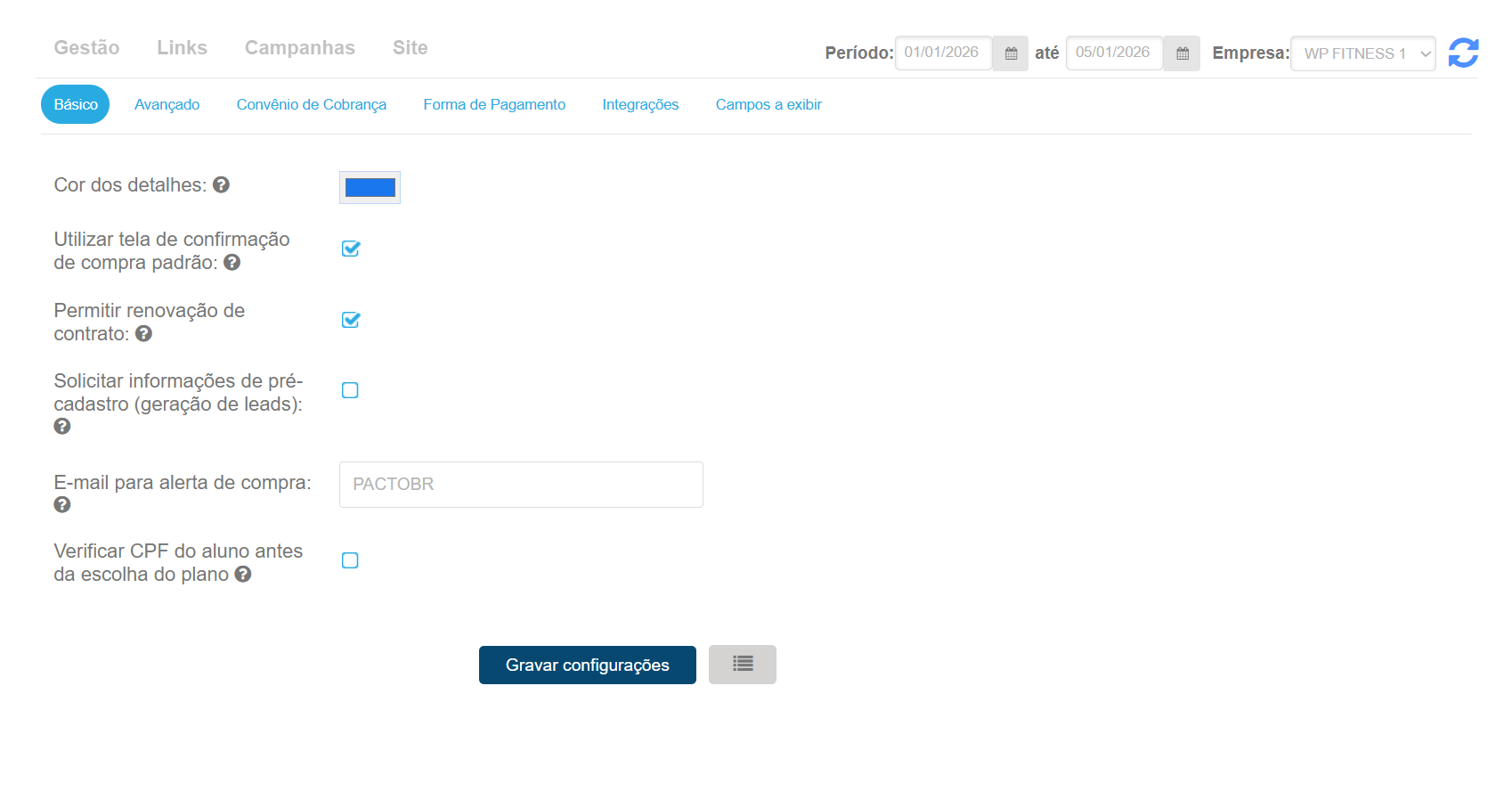 • Integração GymBot: marque esta opção apenas se desejar utilizar o seu site integrado aos serviços da GymBot;