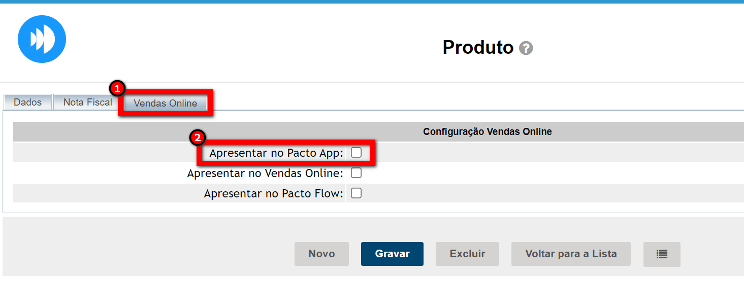 4. Ao carregar a tela de configuração do produto, clique na guia “Vendas Online“, depois marque o checkbox a frente da configuração “Apresentar no Pacto App“;