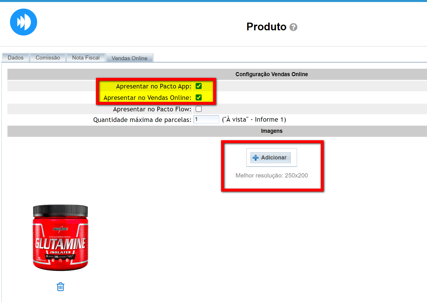 Observação: para ser apresentada a configuração de adicionar uma imagem para representar o produto, é preciso marcar também a opção “Apresentar no Vendas Online“.