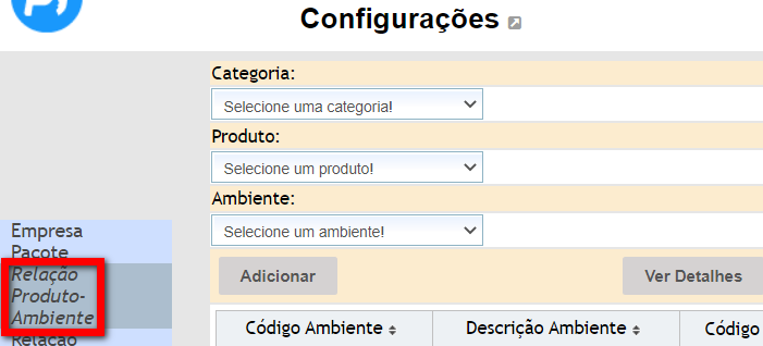 • Produto: neste campo, selecione o produto que deseja relacionar com o ambiente;