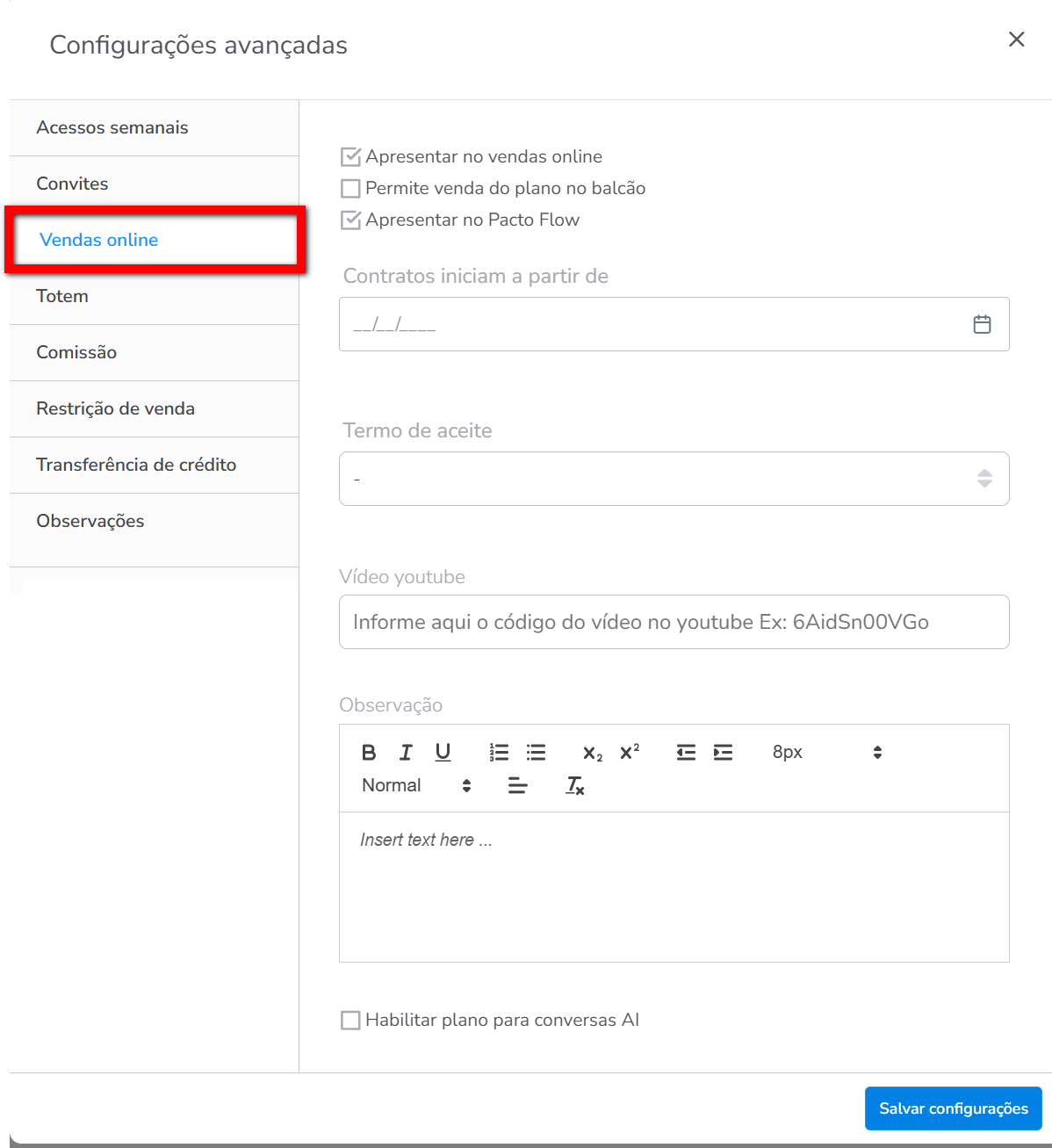 • Permitir turmas no Vendas Online: ao marcar está configuração permite realizar a venda com a marcação na turma pelo vendas online;