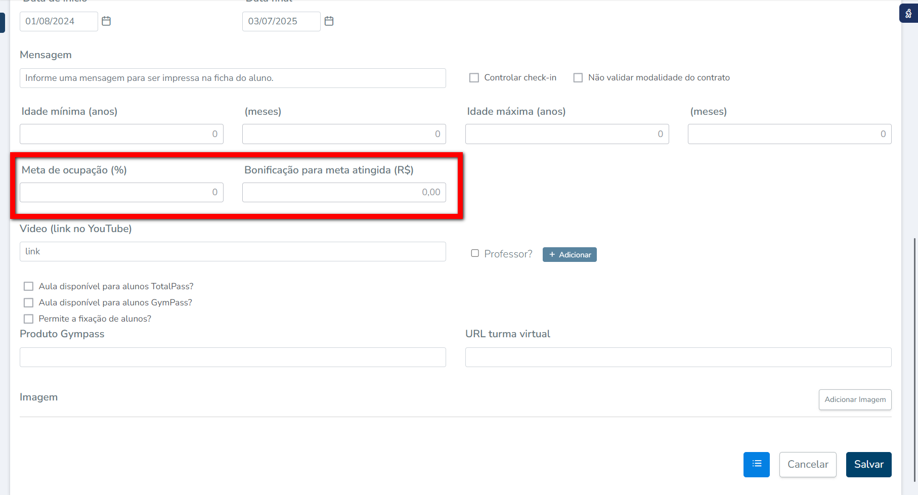 - Meta de ocupação (%): defina neste campo uma porcentagem de ocupação mínima que a aula deve atingir, para que o sistema considere esta no indicador de aulas bonificadas;