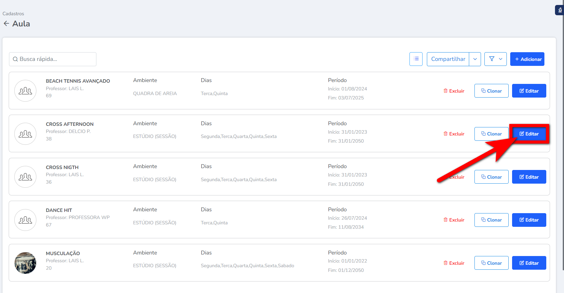 3. Localize a aula que deseja configurar a bonificação e clique em “Editar“;