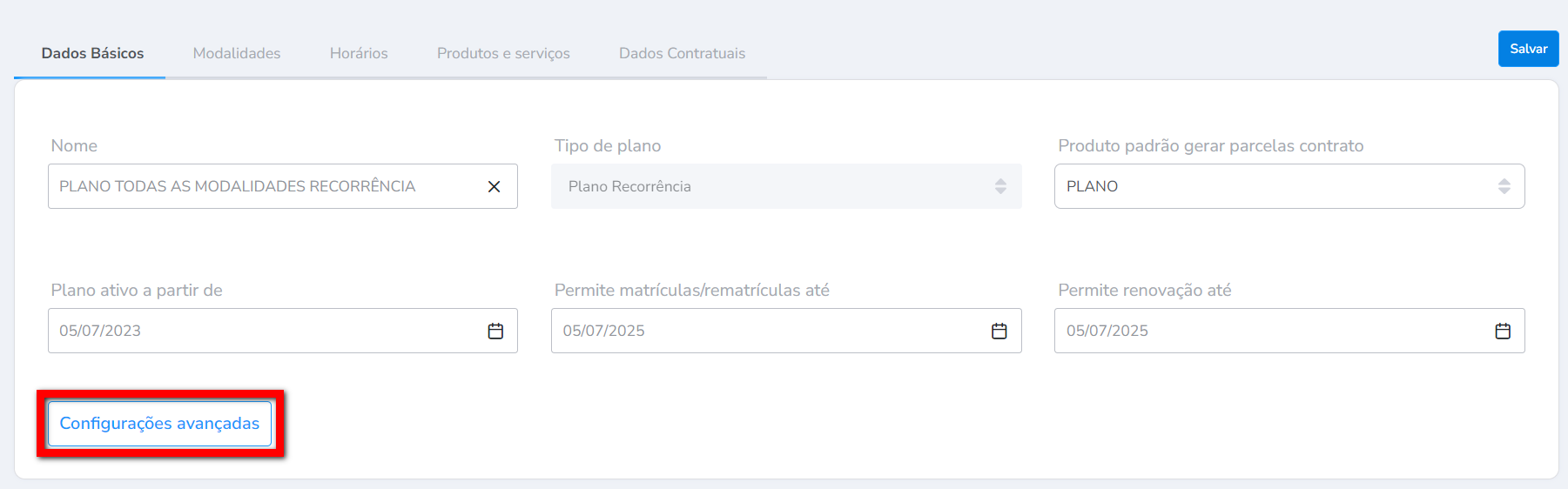 2. Após abrir a tela de planos cadastrados, entre no plano que deseja disponibilizar convites, logo na primeira aba do plano “Dados Básicos” clique no botão “Configurações Avançadas“;