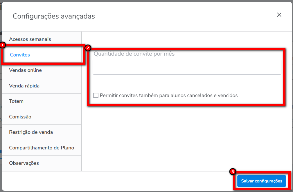 3. Será apresentado um pop-up clique na guia “Convites“, determine a quantidade disponibilizada por mês e por fim clique em “Salvar configurações“;