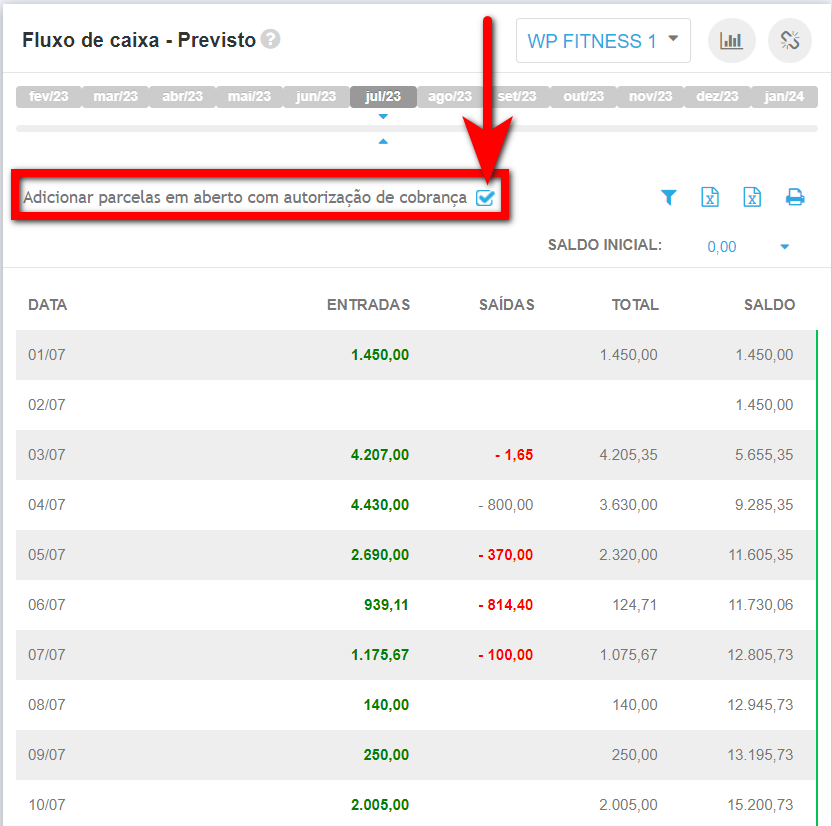 Observação: marcando essa opção, todas as parcelas em aberto, buscando por data de vencimento, que possui autorização de cobrança, serão consideradas como entradas no Fluxo de caixa.