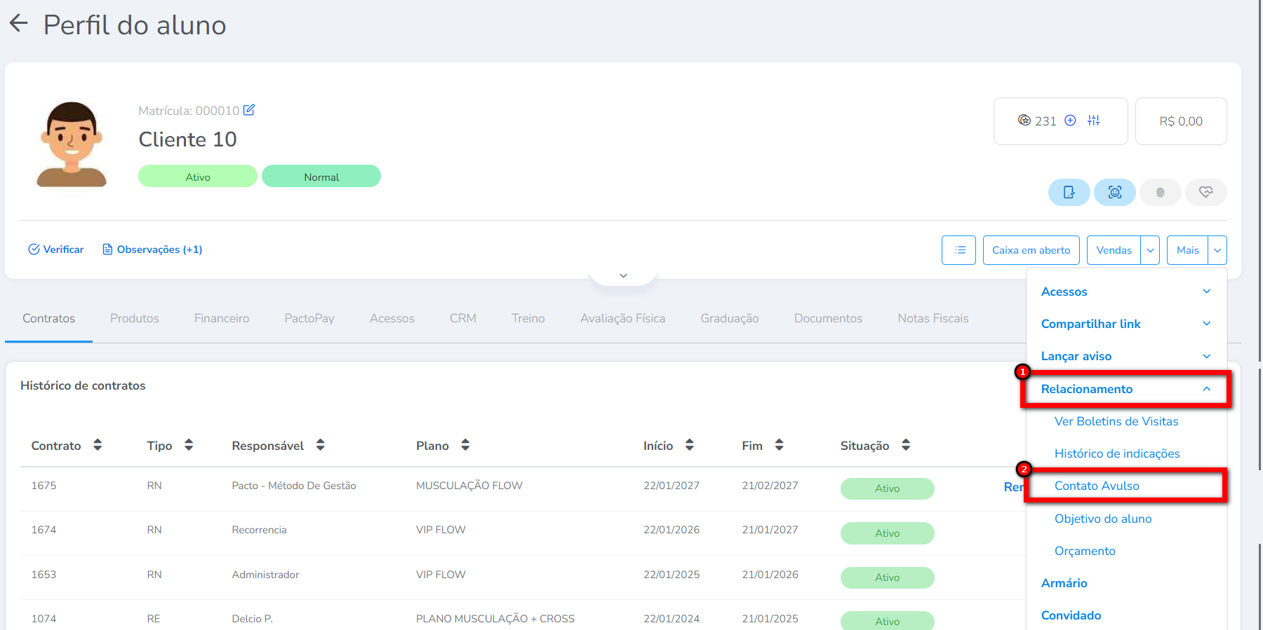 2. Clique em “Realizar Contato” ou no menu da lateral esquerda, clique em “Relacionamento” e após clique em “Contato Avulso”;