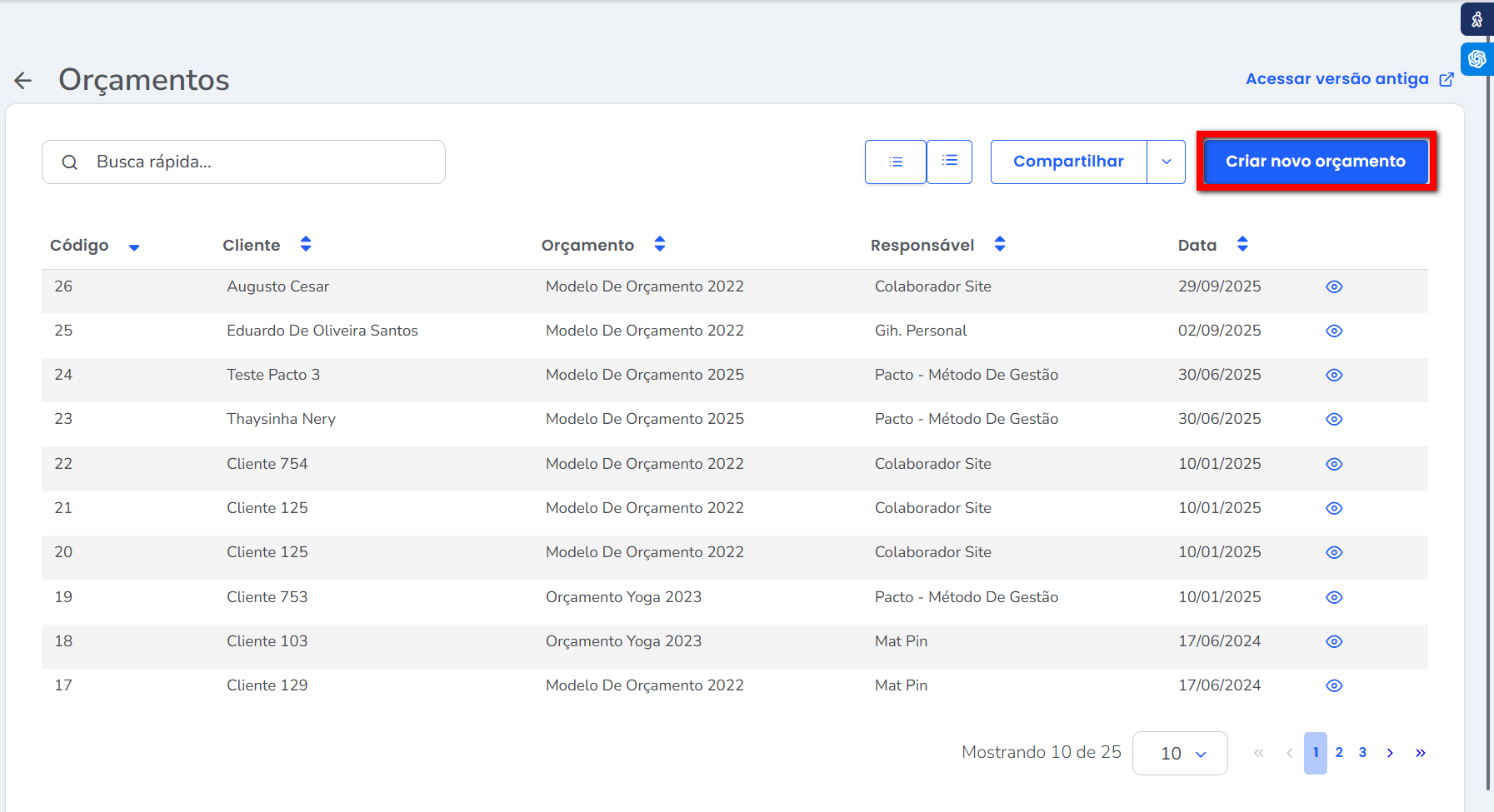 2. Será direcionado à tela do orçamento. Clique em “Criar novo orçamento“;