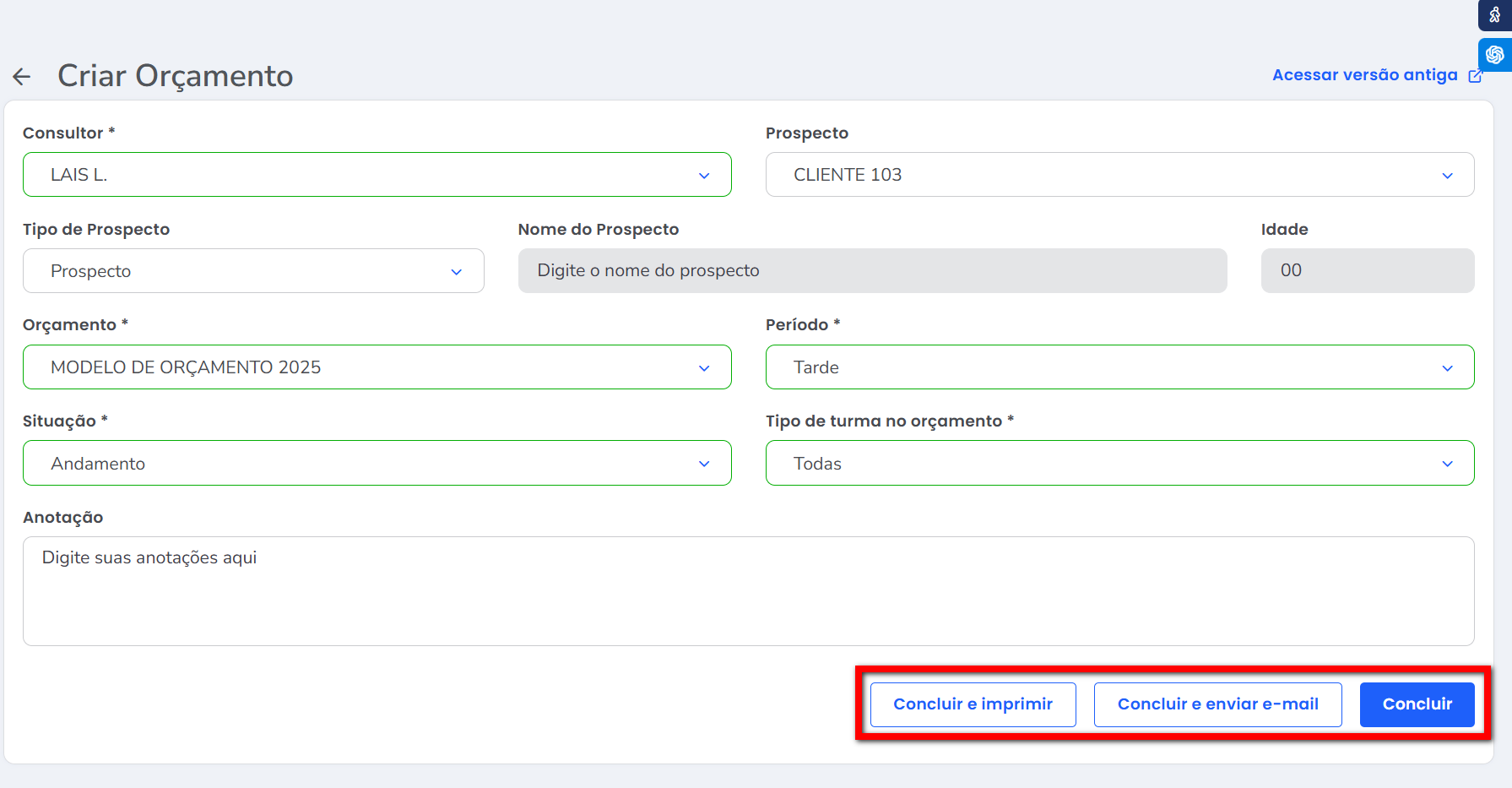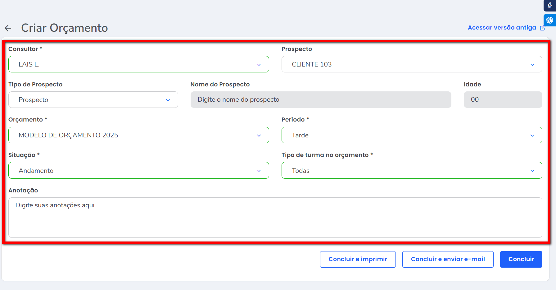 - Consultor: selecione o consultor responsável pelo orçamento;