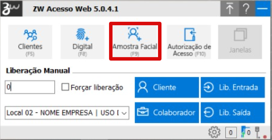 1. Já na tela do programa ZW Acesso, aperte o número “zero (0)” para abrir o pop-up onde se faz a liberação de acesso dos alunos, e clique em “Amostra Facial“;