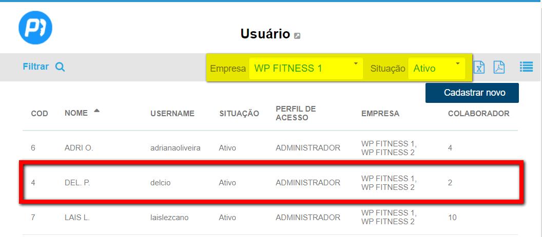 2. O sistema listará os usuários cadastrados (fique atento aos filtros);