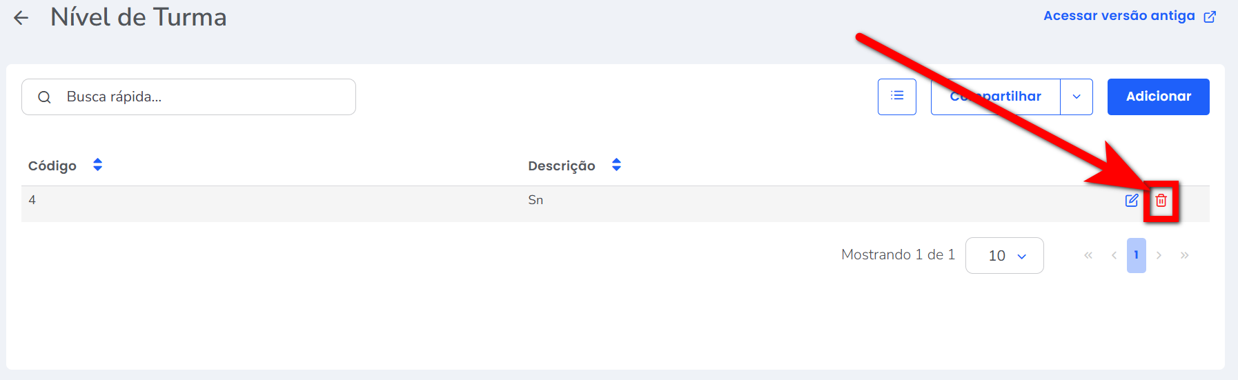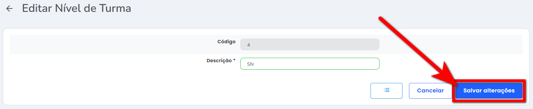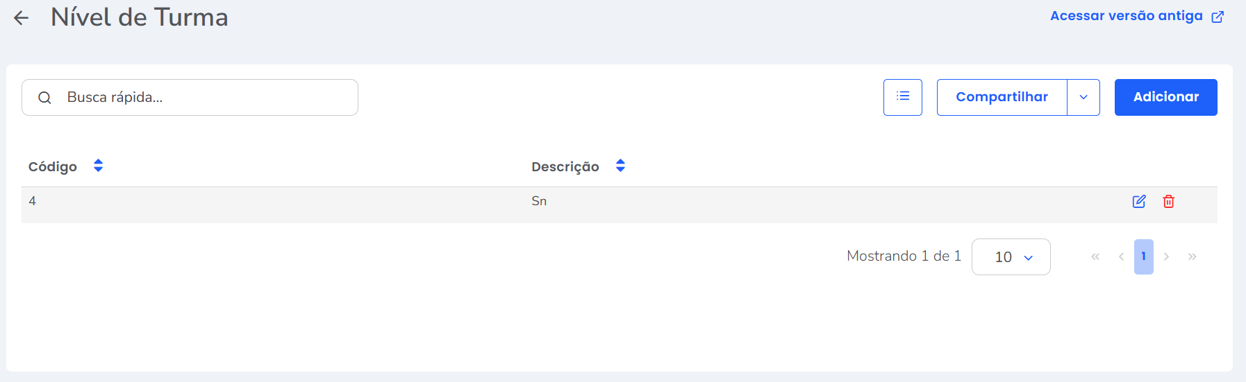 3. Será apresenta a tela com os níveis de turmas cadastrados anteriormente. Localize e clique sobre o nível que deseja editar;